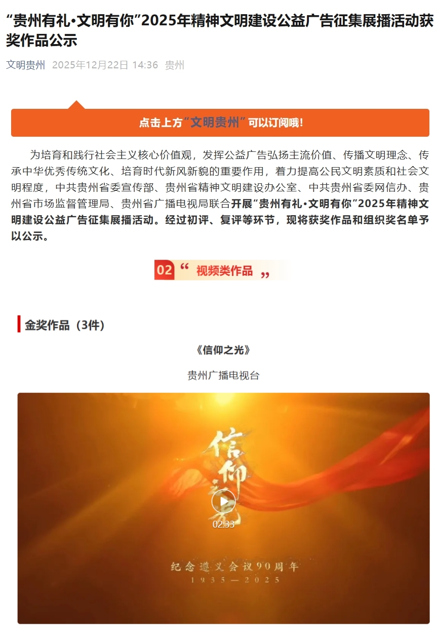 由中共贵州省委宣传部、贵州省精神文明建设办公室、中共贵州省委网信办、贵州省市场监督管理局、贵州省广播电视局联合开展的“贵州有礼·文明有你”2025年精神文明建设公益广告征集展播活动获奖作品公示,贵州广播电视台卫视中心制作的全国首部长征题材水下影像作品《信仰之光》荣获视频类金奖。