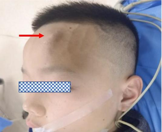 11岁的小强(化名)父母亲从小便发现他左侧额头部有一包块,并未引起重视,近4年以来包块逐步增大,可见到包块周围“青筋暴露”,可扪及波动感(图1A)。小强父母很着急,带着他辗转多家医院后来到省医小儿外科门诊就诊,完善增强CT检查显示左额部畸形血管团,医生考虑诊断左额部动静脉畸形,小强被安排住进小儿外科病房。