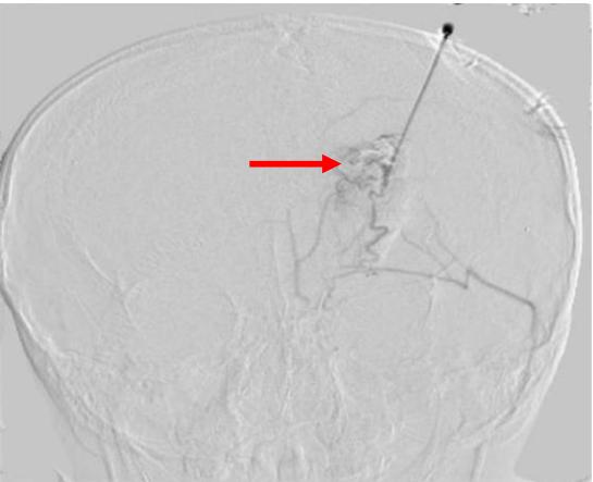 图1 患儿临床资料:A.箭头指示患儿左额部包块 B.箭头指示血管造影下左额部畸形血管团(瘤巢)