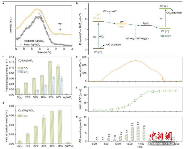 在本项研究中,研发团队模拟植物暂存光生电子的生理机制,创新设计出一种电子存储路径,通过定向设计、制备材料结构,使其能够在光照时储存电子,并在需要时精准释放,从而实现对二氧化碳与水反应速率和程度的精确调控。