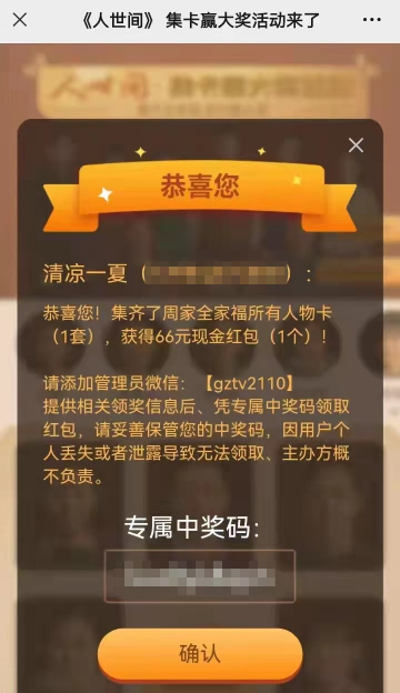 当您集齐全家福便会收到专属中奖码。请保管好您的专属中奖码,添加管理员微信:gztv2110,向管理员提供相关领奖信息后,凭专属中奖码领取红包。