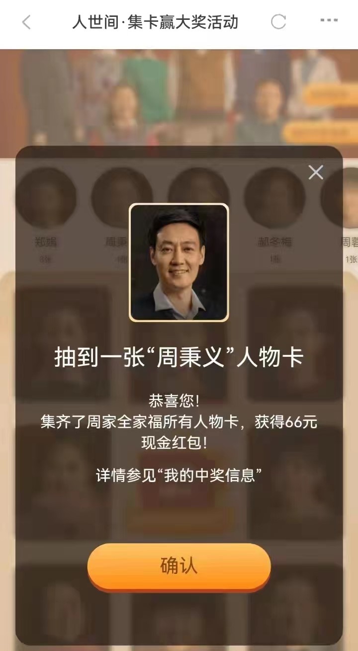 集卡活动还将持续进行,每晚收看贵州卫视《人世间》,寻找收视密码,抽取剧中角色人物卡,集齐8张人物角色卡,即可赢取66元现金红包。