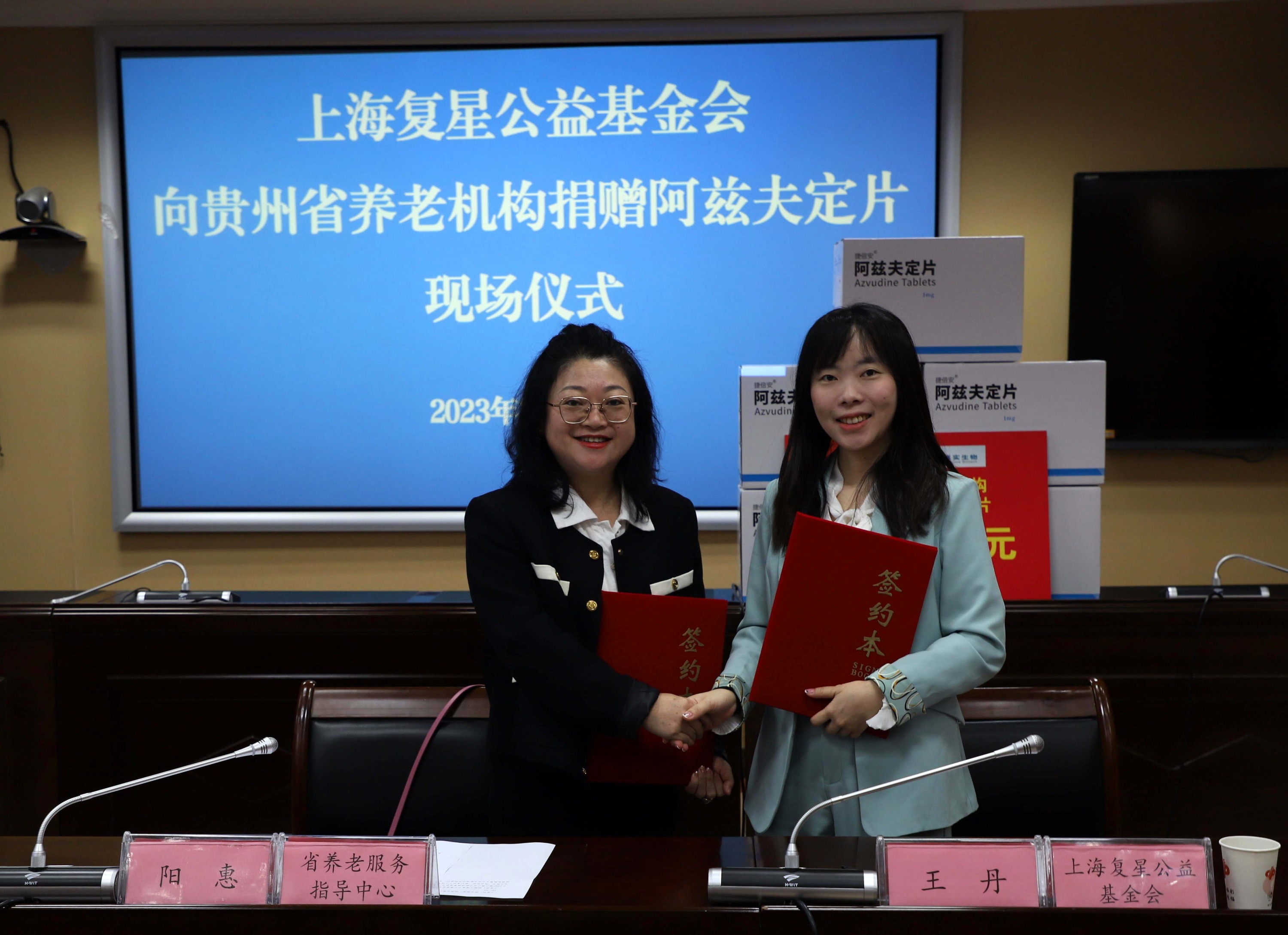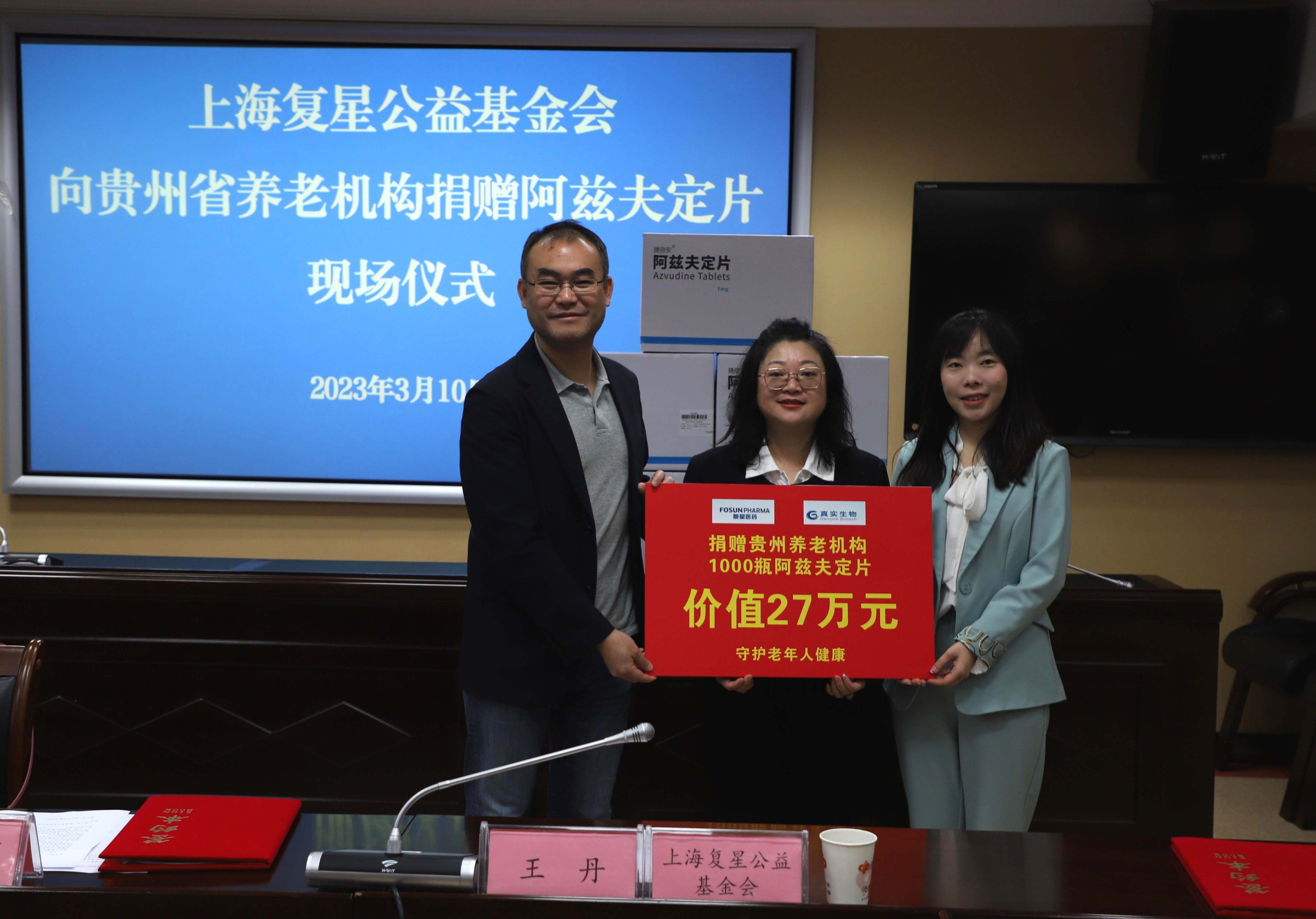 3月10日,上海复星公益基金会与贵州省民政厅在贵阳举行捐赠仪式,向贵州省养老机构捐赠阿兹夫定片1000瓶,价值约27万元人民币。上海复星公益基金会贵州区负责人、贵州省民政厅相关业务处室负责人参加捐赠仪式,省养老服务指导中心负责人主持仪式。