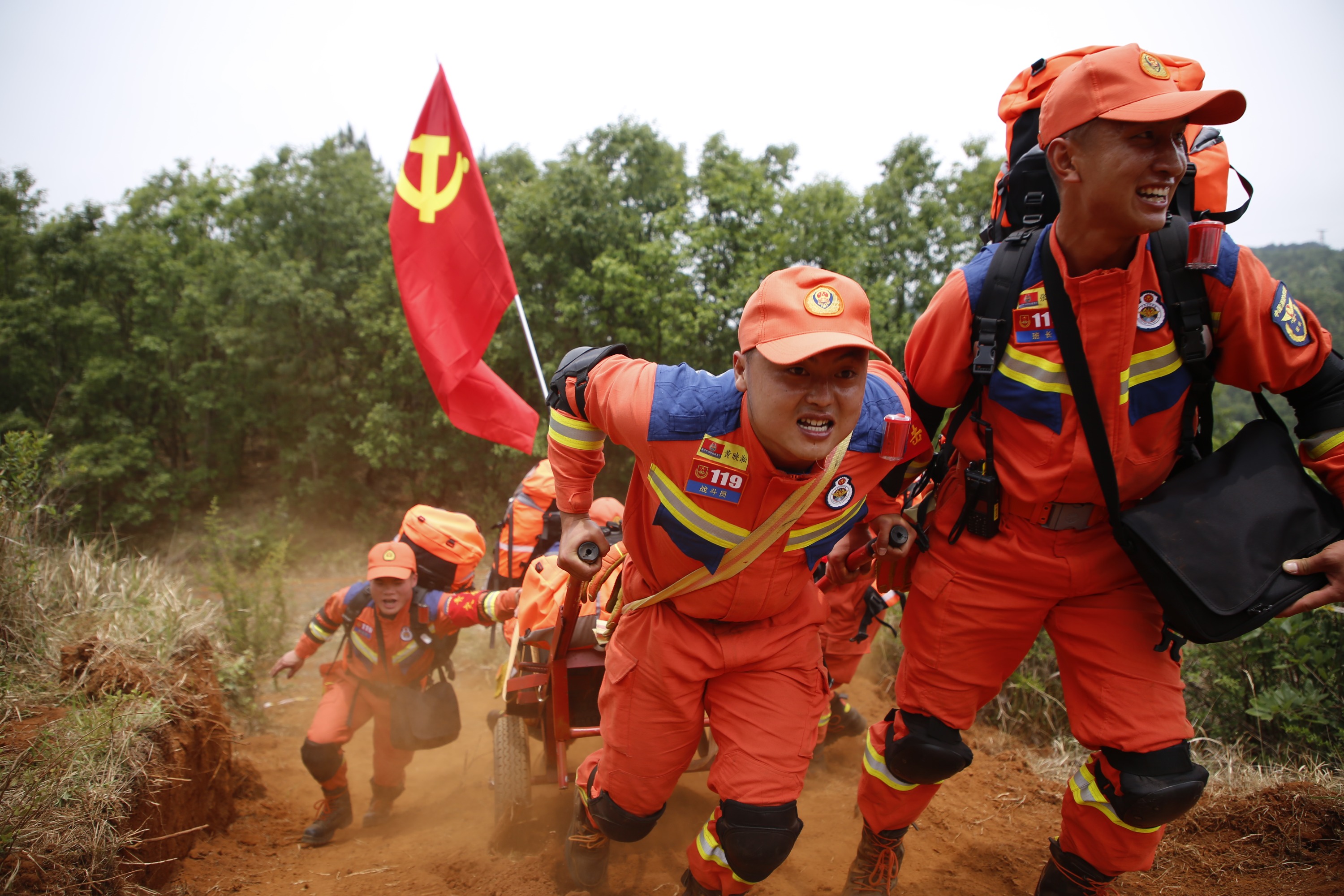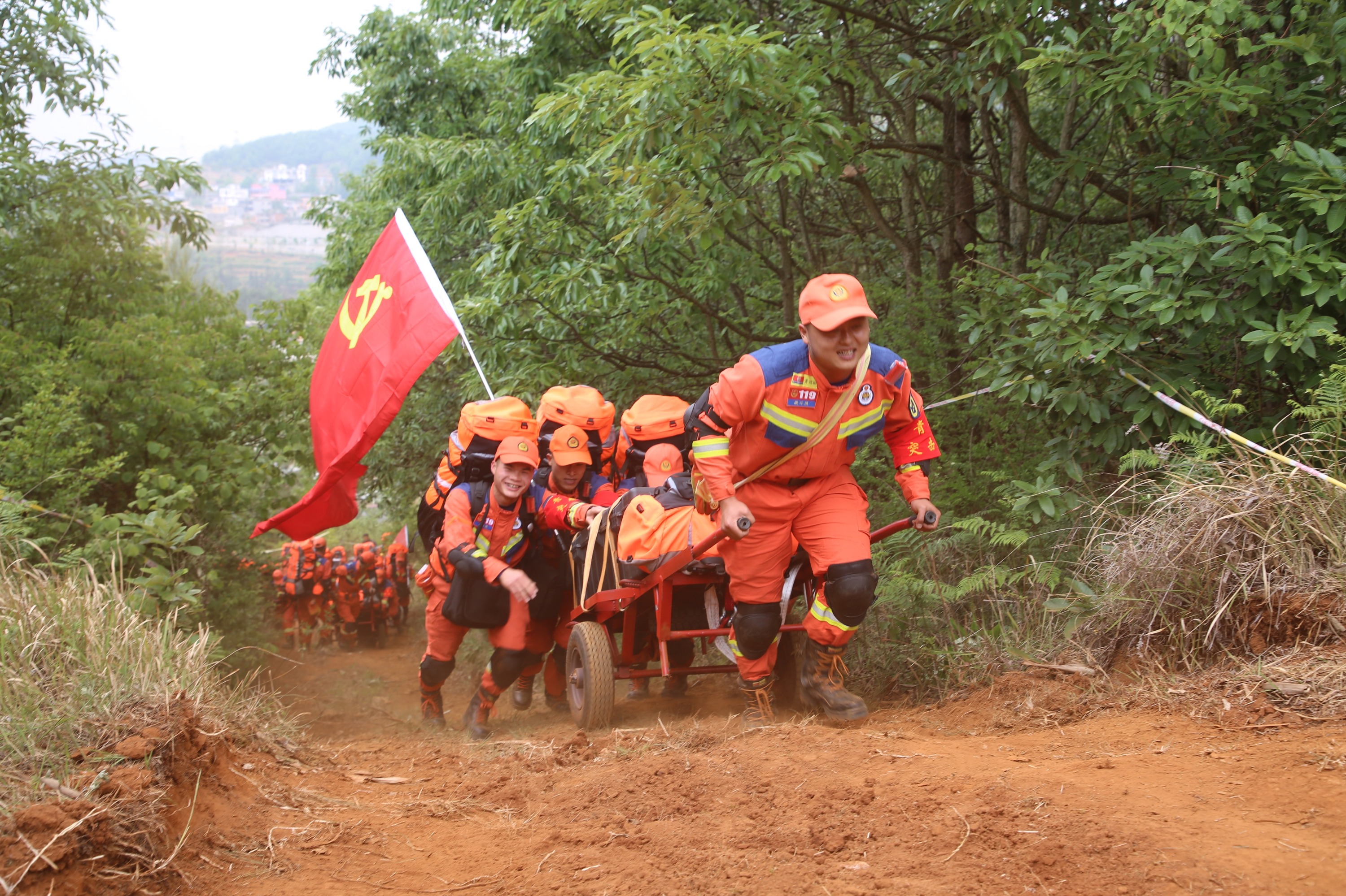 一路上,现场政工组不断为指战员呐喊助威,带领大家歌唱消防组歌,提振队伍士气。在指战员们的互帮互助、努力拼搏下,安顺市消防救援支队地震救援轻型搜救队一路高歌猛进,成功完成了重装徒步行进任务。