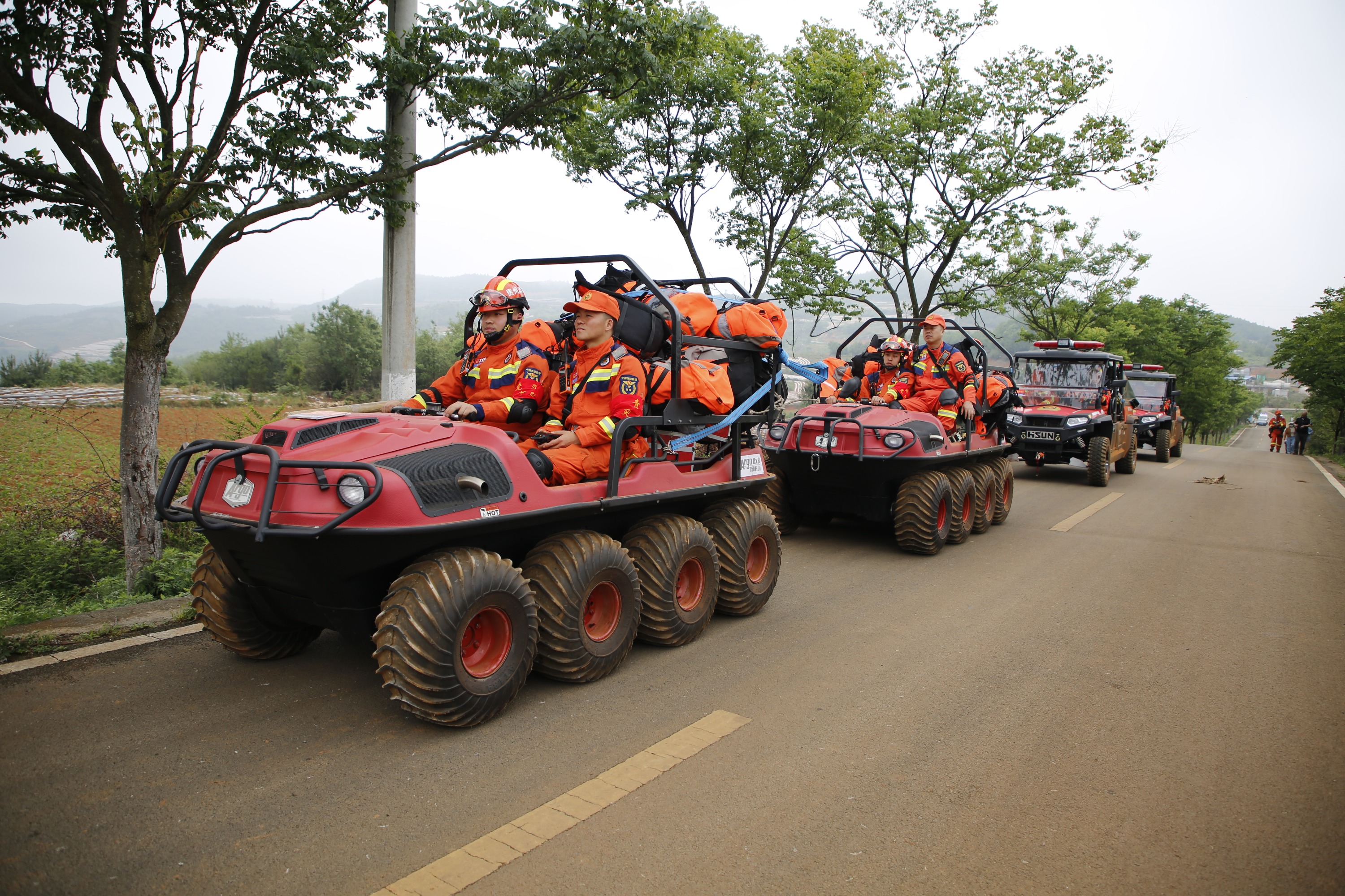 上午12时,安顺市消防救援支队地震救援轻型搜救队到达指定地点。按照灾情设定,“灾区”道路被地震损毁、车辆无法到达震中区域。