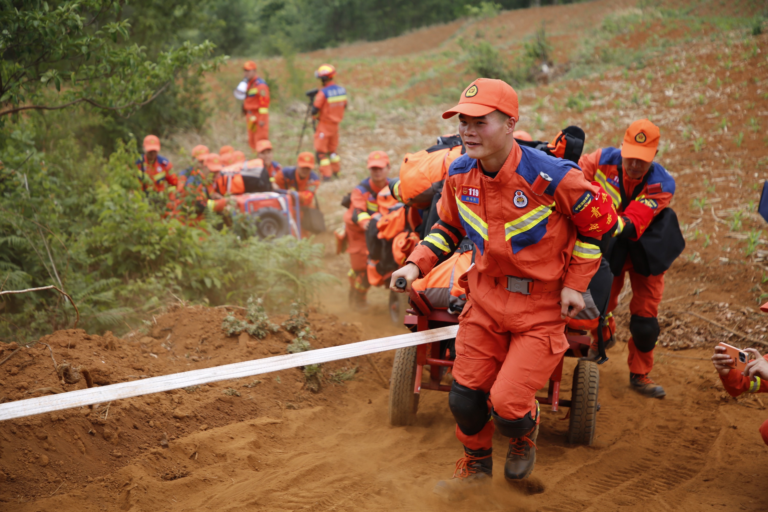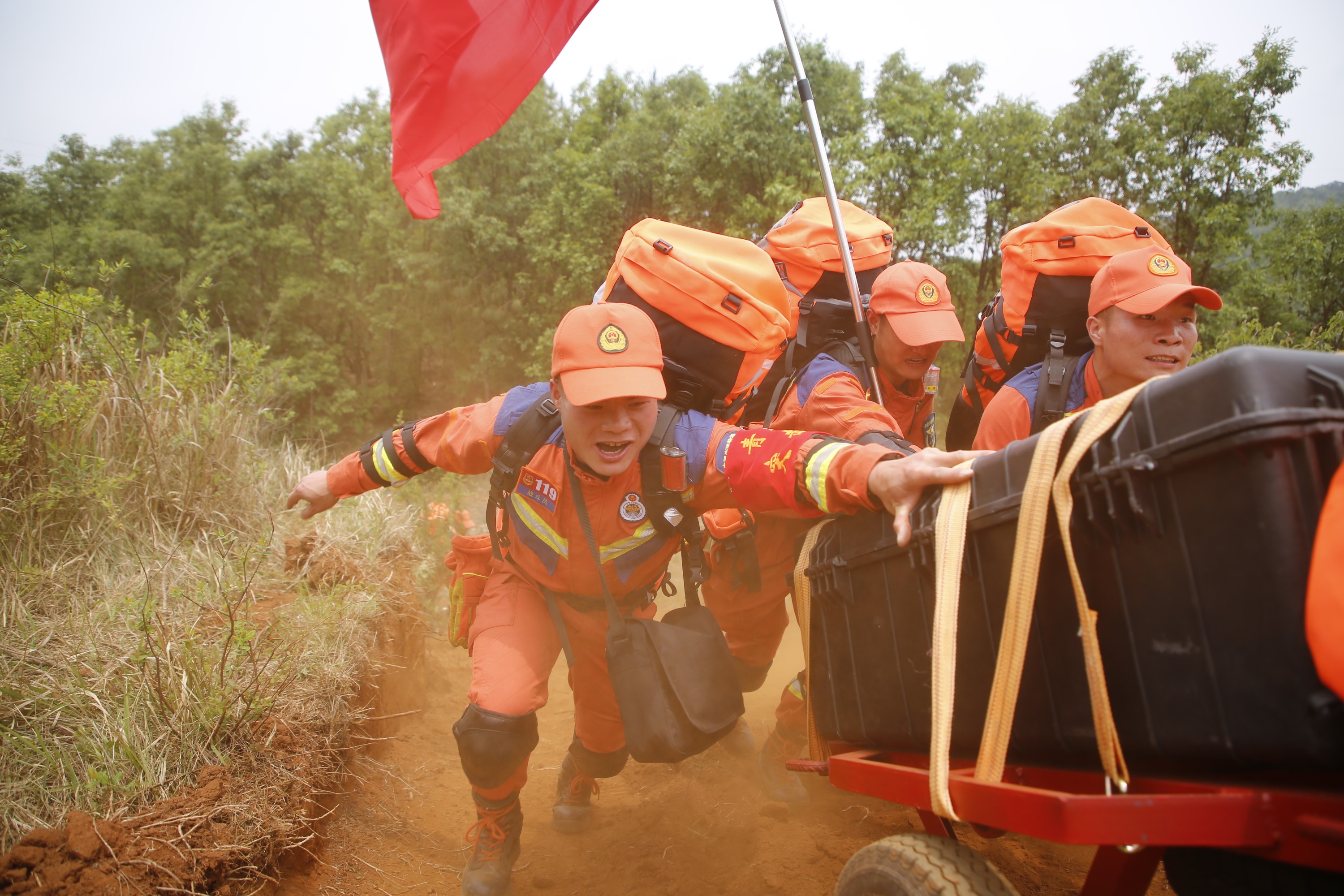 重装徒步中,每个指战员都肩背40公斤的72小时保障行囊,手推数百斤的器材装备,在崎岖泥泞、坡度超过60度的羊肠小道上艰难前行。