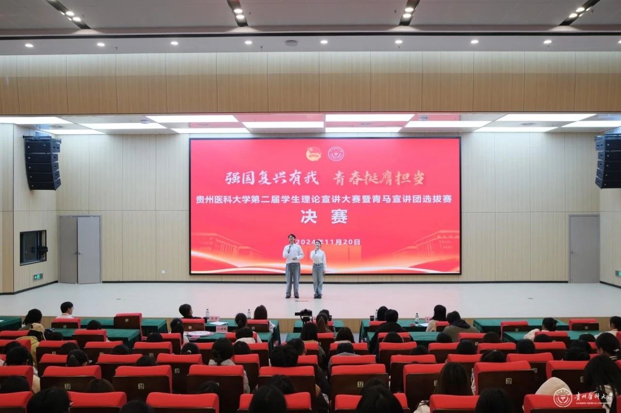 近日,贵州医科大学第二届“强国复兴有我,青春挺膺担当”学生宣讲大赛决赛暨青马宣讲团选拔赛在学校云漫湖校区道德讲堂举办。本次活动旨在庆祝中华人民共和国成立75周年,深入学习贯彻习近平新时代中国特色社会主义思想,贯彻落实党的二十届三中全会精神和省委十三届五次全会精神,鼓励广大学生用青年视角讲好中国故事、发好时代新声,营造凝心聚力、团结奋斗的浓厚校园氛围。贵州民族大学团委书记胡斌、贵州师范学院团委书记周煜、贵州师范大学团委副书记尹瑶、贵州财经大学团委副书记陈伟及学校团委书记王妤煜担任比赛评委。现场座无虚席,各学院师生代表800余人观看。决赛由青马宣讲团成员何雨沁、邓尚轩主持。