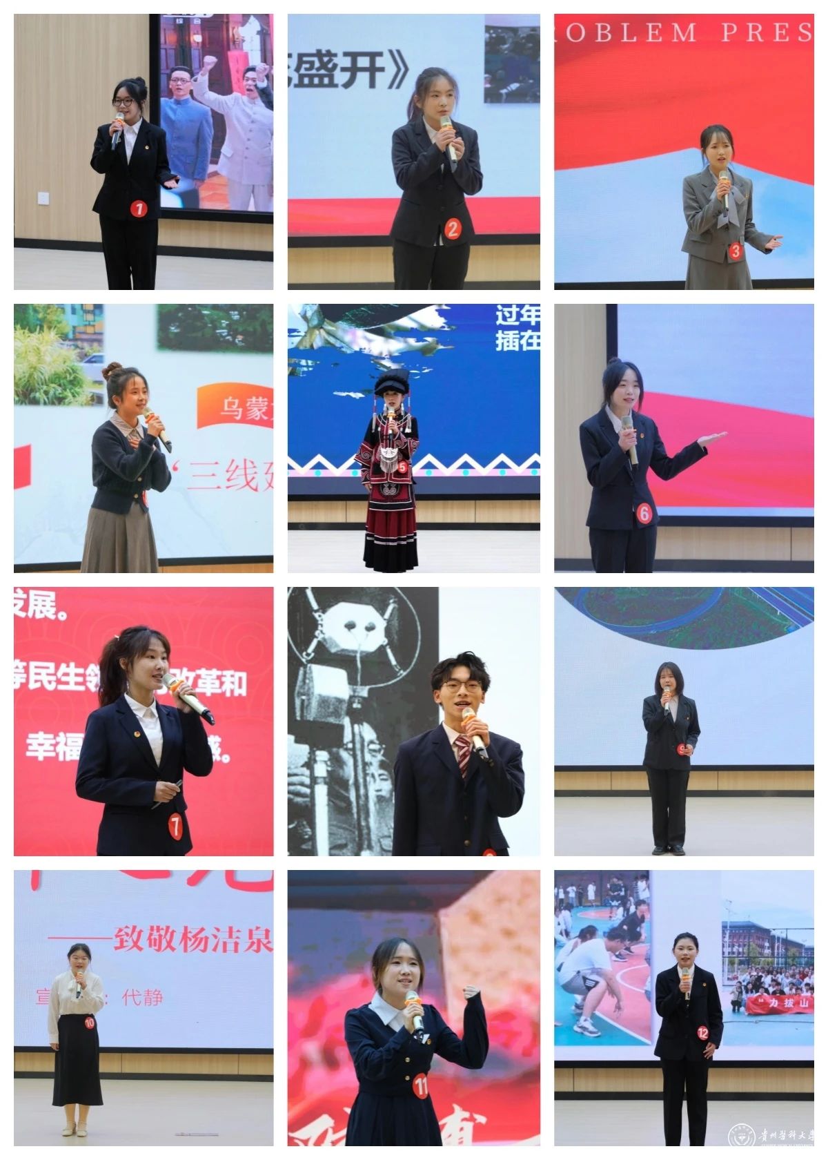 本次活动得到了广大学生的积极响应,通过自主报名、学院推荐、初赛、复赛,12名选手从100余名初赛选手中脱颖而出入围决赛。比赛现场,来自各学院的选手们围绕党的二十届三中全会精神、习近平总书记在贵州考察时的重要指示精神和铸牢中华民族共同体意识等内容带来了一场情感真挚、状态饱满、催人奋进的青年宣讲。