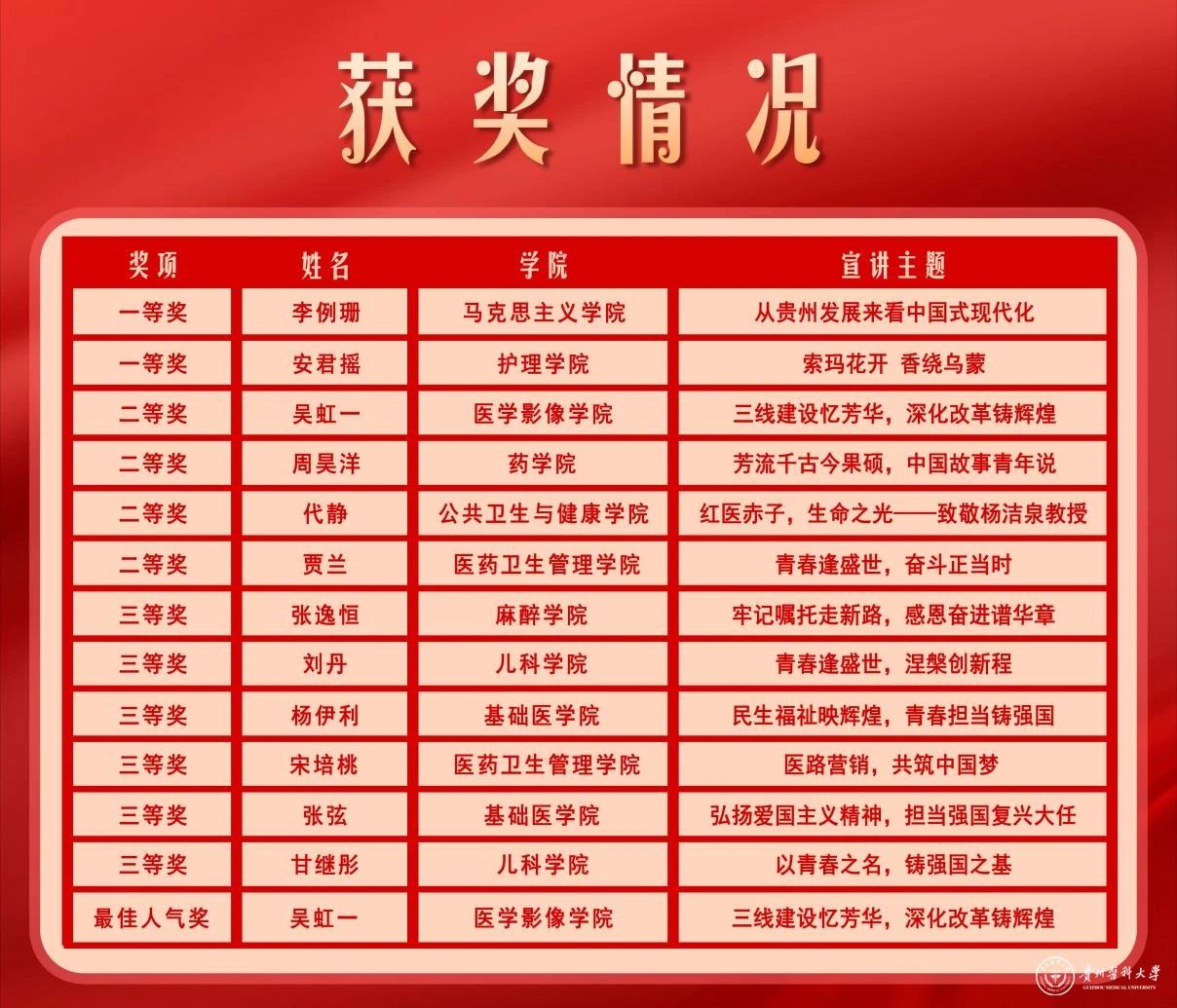 用青春的力量传播党的声音,用蓬勃的朝气诠释思想的活力。学校将持续开展好学生宣讲大赛、建设好学生宣讲队伍、广泛开展宣讲活动,让青年人成为“学”的主角,“讲”的主力,“听”的主体,推动党的创新理论在青年群体中入脑入心。以宣讲的薪火,点燃广大贵医青年奋斗的激情,奋力书写为中国式现代化挺膺担当的青春篇章。