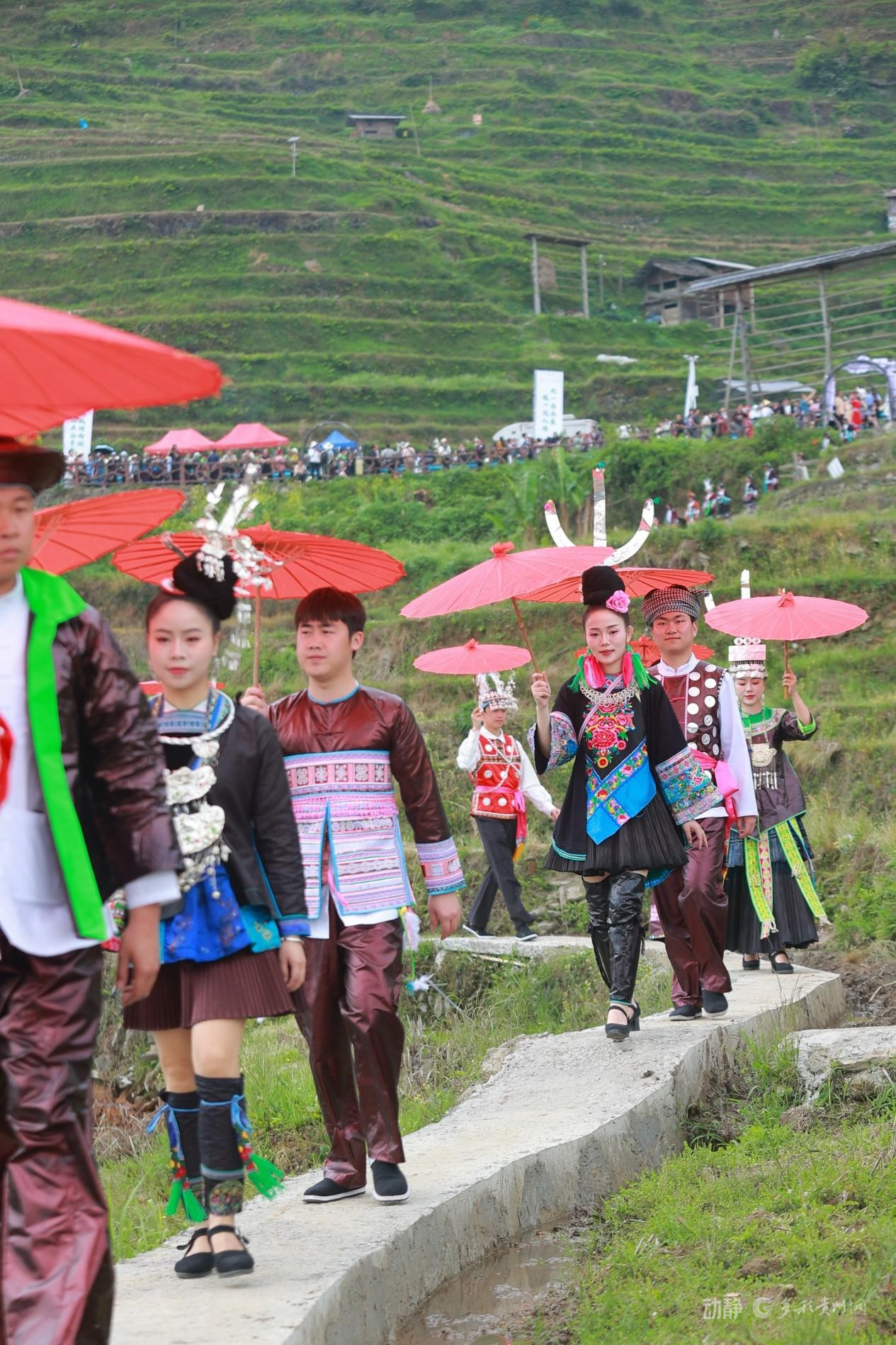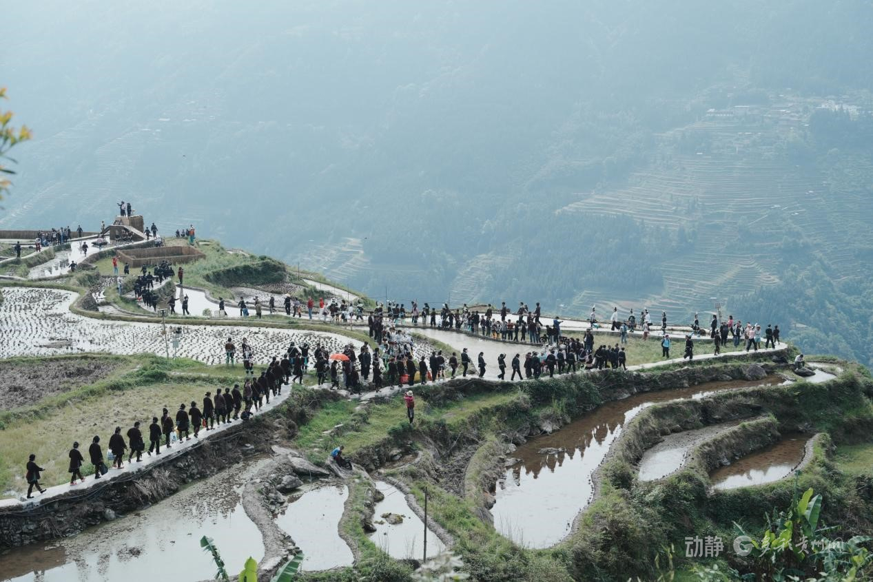 4月19日上午10时,作为活动核心的开秧门盛典在五号观景台隆重举行。在寨老的主持下,身着盛装的苗族同胞依循古礼,诵读祭文、献祭祈福,随后展开声势浩大的梯田巡游。牛耕、船耕、人耕三种传统耕作方式依次展演,老农扶犁、水牛缓行、木船破水,插秧与放鱼苗同步进行,完整再现了“稻鱼鸭”共生系统的农耕智慧。