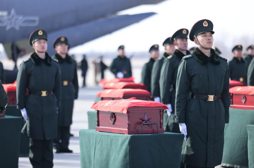 仪式现场庄严肃穆,志愿军烈士遗骸的棺椁覆盖着五星红旗,到场迎接的解放军官兵军容威严、持枪鹄立,现场全体人员向烈士遗骸行三鞠躬礼,以此表达对先烈们的深切缅怀和无限哀思。
