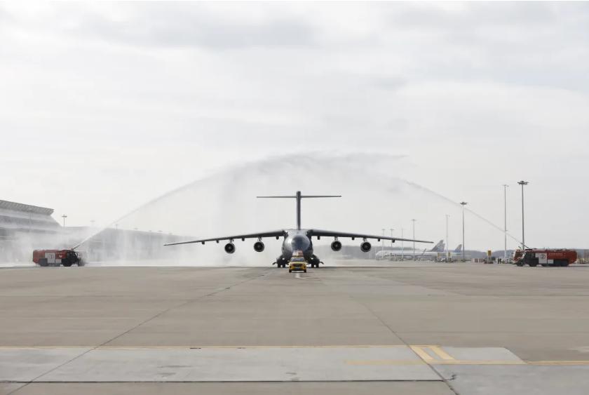 11月28日上午,空军专机运-20降落在辽宁沈阳桃仙国际机场。沈阳桃仙机场以“过水门”航空最高礼仪迎接志愿军烈士遗骸回家。陈建辰 摄