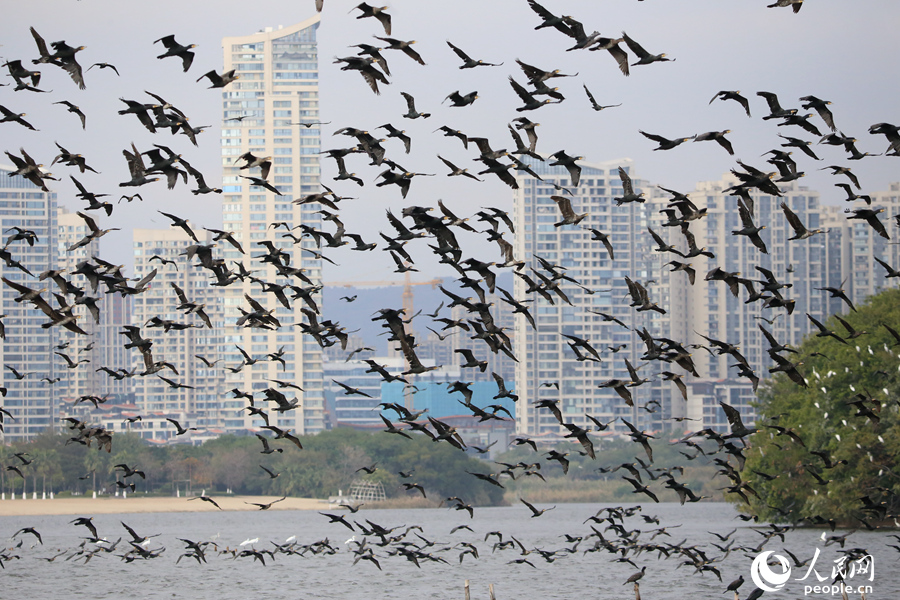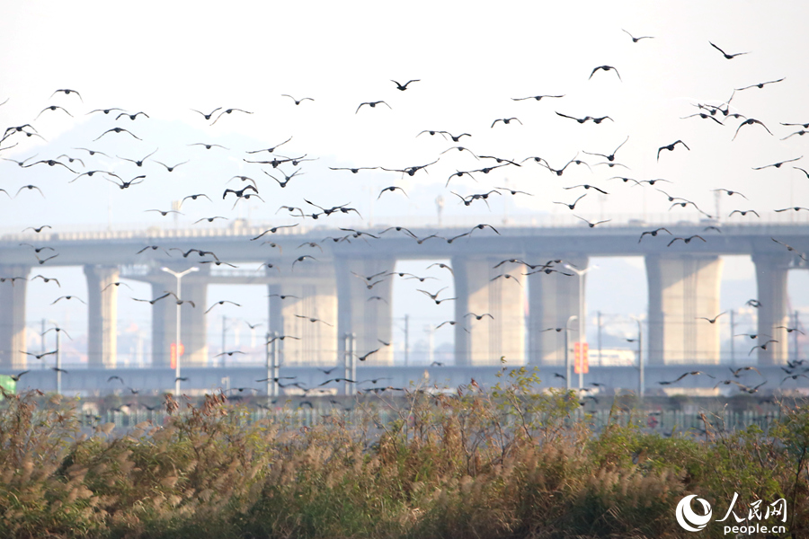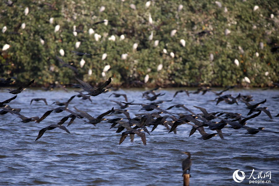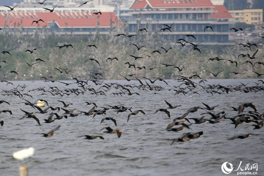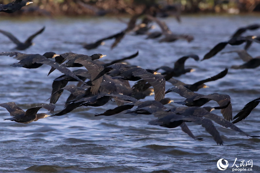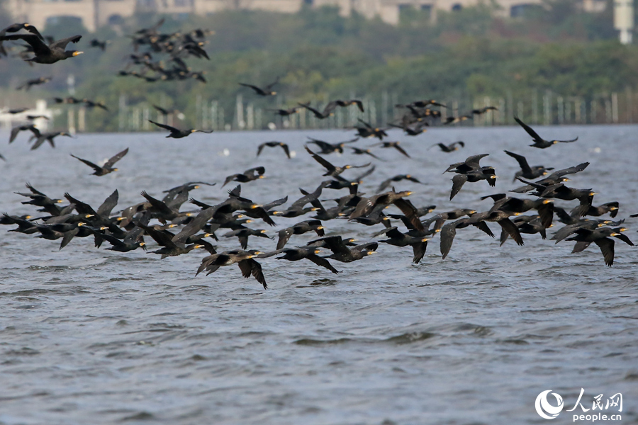 成群普通鸬鹚飞抵厦门集美杏林湾。人民网 陈博摄