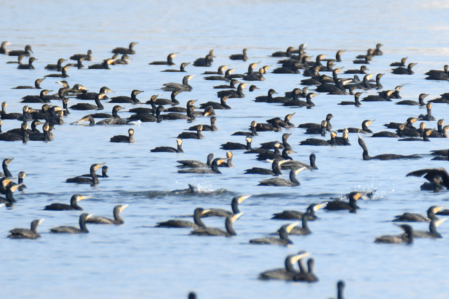 普通鸬鹚在白鹭栖息的生态小岛附近围猎鱼群。人民网 陈博摄