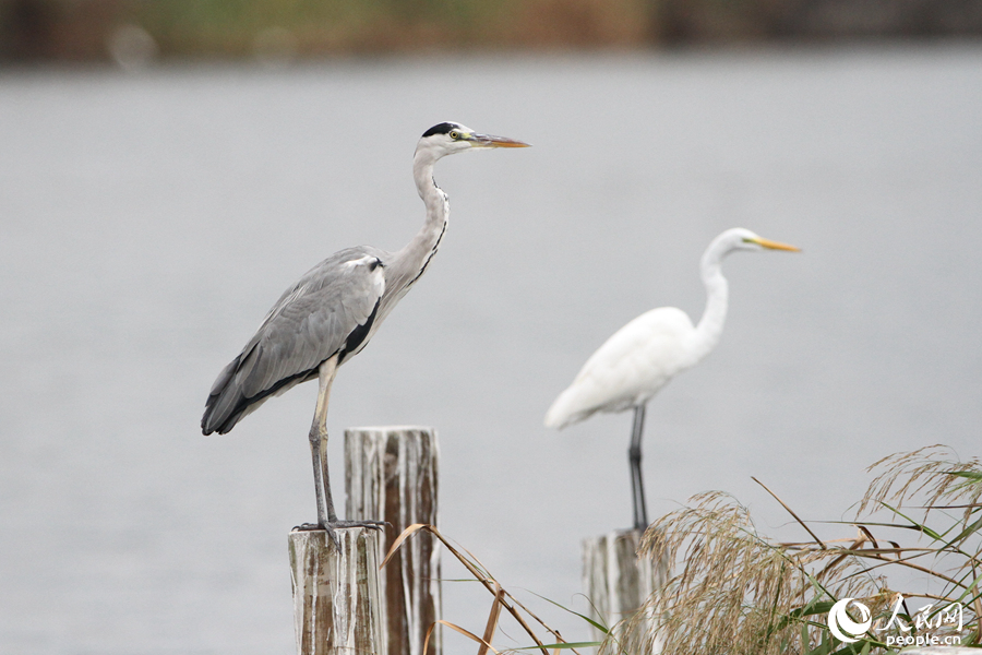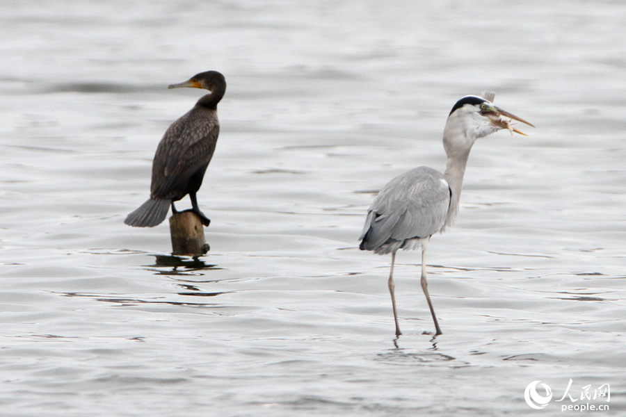 普通鸬鹚和苍鹭。人民网 陈博摄