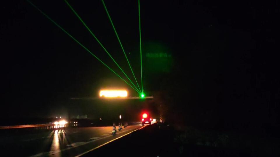 贵阳高速支队在渝筑高速遵贵复线段,选择了2处车流量大、视野比较开阔的地方安装了能够射出绿色光束的设备,提醒过往司机安全行驶。