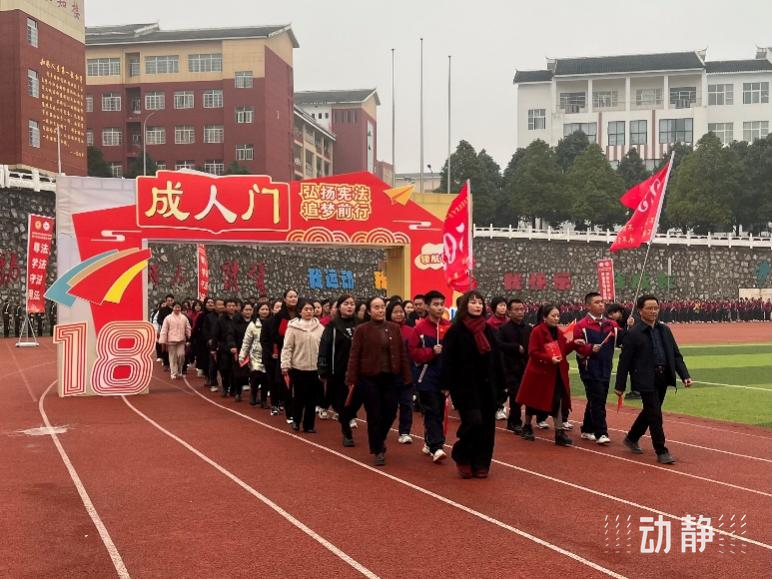 学生在老师和家长的带领下跨过“成人门”,佩戴了徽章和成人帽,并被赠予宪法读本,随后集体向宪法宣誓。学生们还表演了苗族锦鸡舞《成长之路》、侗歌《歌颂宪法》,《宪法伴我们成长》合唱等节目。