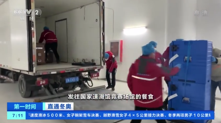 记者看到一批从北京冬奥村运动员餐厅出来的,发往国家速滑馆竞赛场馆的餐食。工作人员正在将餐食搬运到车厢里面。