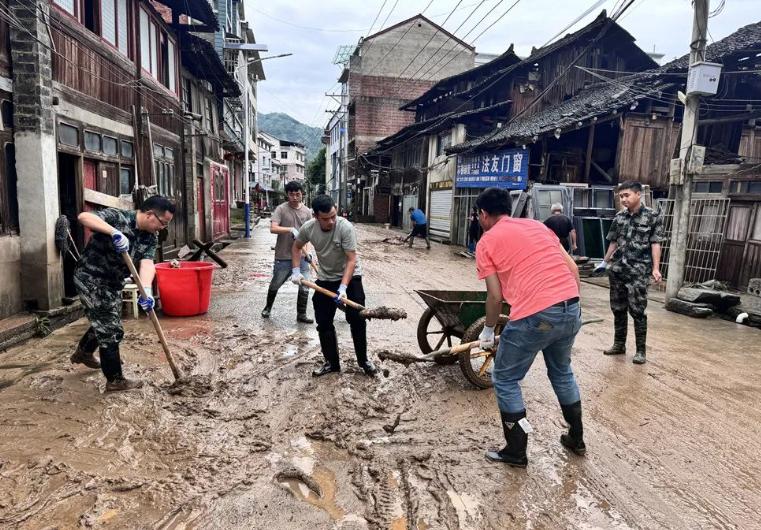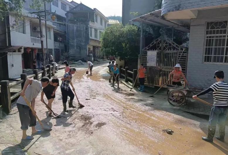 地稠村退役军人志愿者积极主动投入到清淤工作中。他们一铲一铲地清除道路上的淤泥和垃圾,然后用消防机动泵冲洗寨内道路,村寨渐渐恢复了原来样貌。群众纷纷表示:党员干部和退役军人志愿者及时到现场帮忙,让他们感受到了党的温暖和力量。