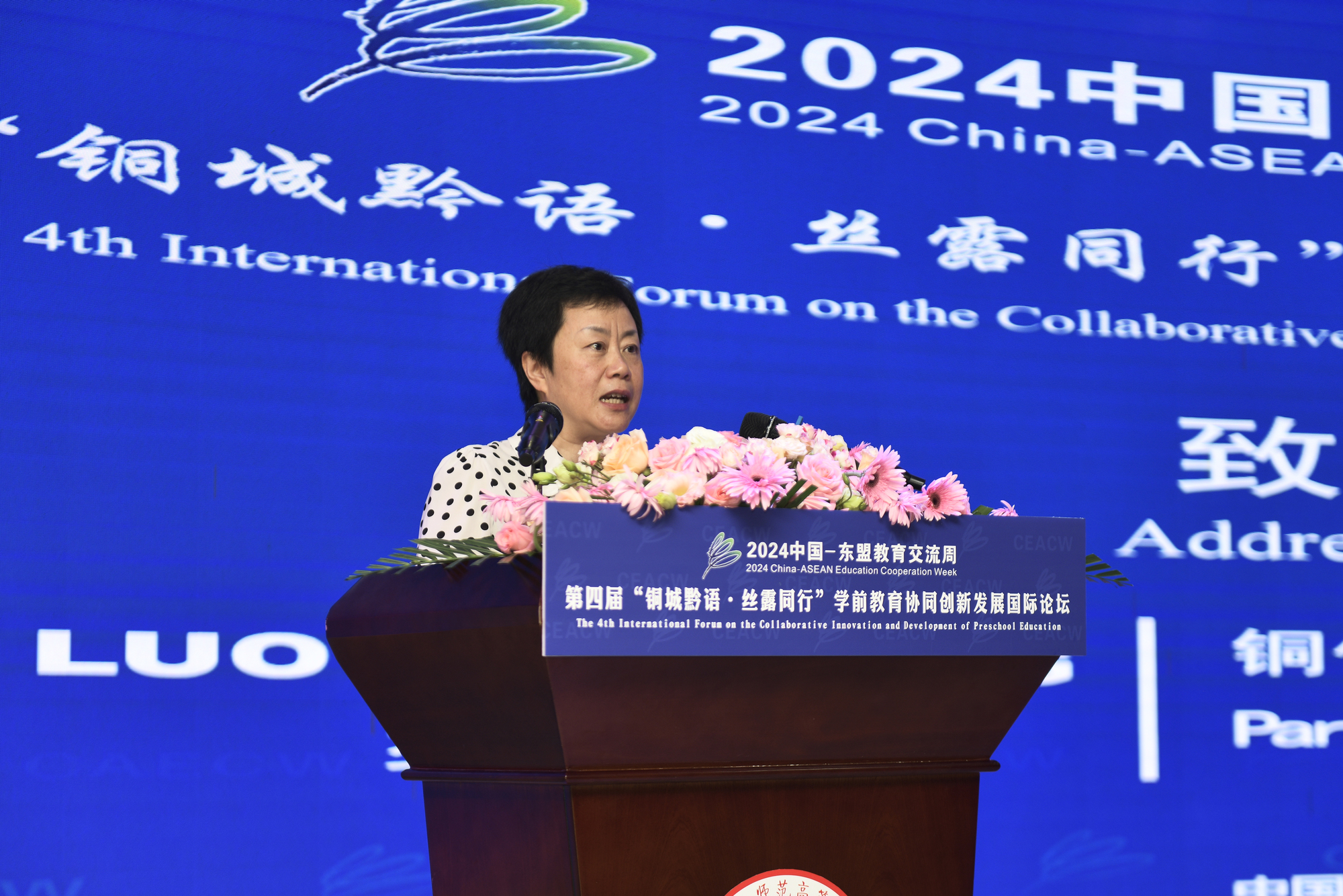 罗红芳在致辞中指出,铜仁幼儿师范高等专科学校在105年办学历程中,坚持“师范性、地方性、开放性、应用性”的办学定位,始终致力于深化学前教育事业高质量发展和人才培养创新改革,先后培养了数以万计扎根乡村教育的卓越托幼师资和助力乡村振兴的高素质技术技能人才。特别是通过“125协同创新计划”“稚雅计划”等助力贵州乡村全面振兴、区域学前教育普惠发展,高质量推进铜仁入选国家级学前教育改革实验区,指导印江县建设的学前教育保障机制实验区,是贵州省唯一入选的全国完善普惠性学前教育保障机制实验区,为推进贵州学前教育贡献了“铜仁智慧”;近年来,学校充分利用“中国-东盟教育交流周”项目等平台,与国(境)外多所高校、机构建立了合作关系,先后在老挝挂牌成立“铜仁幼儿师专老挝海外分校”“铜仁幼儿师专海外附属幼儿园”,举办“中文+学前教育”教师培训暨中老学前教育研讨会,开启了与东盟各国务实合作的新局面,为贵州国际化办学提供了“铜仁样本”。希望各位与会专家学者以本次国际论坛为契机,共同探讨学前教育发展的前沿动态和趋势,深度促进贵州在学前教育领域的国际合作与交流,共同探索并构建一套具有国际视野的学前教育协同创新高质量发展保障体系。