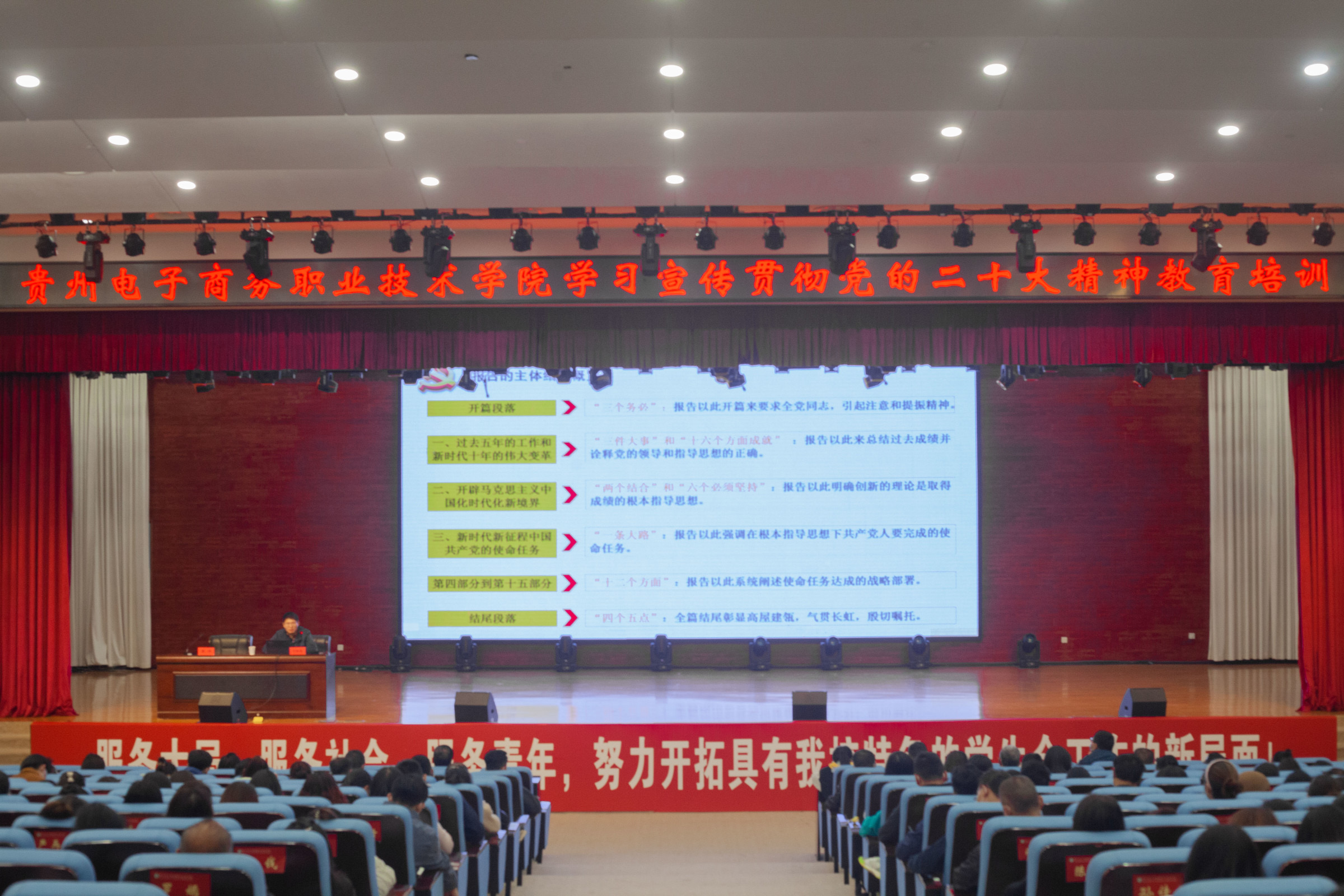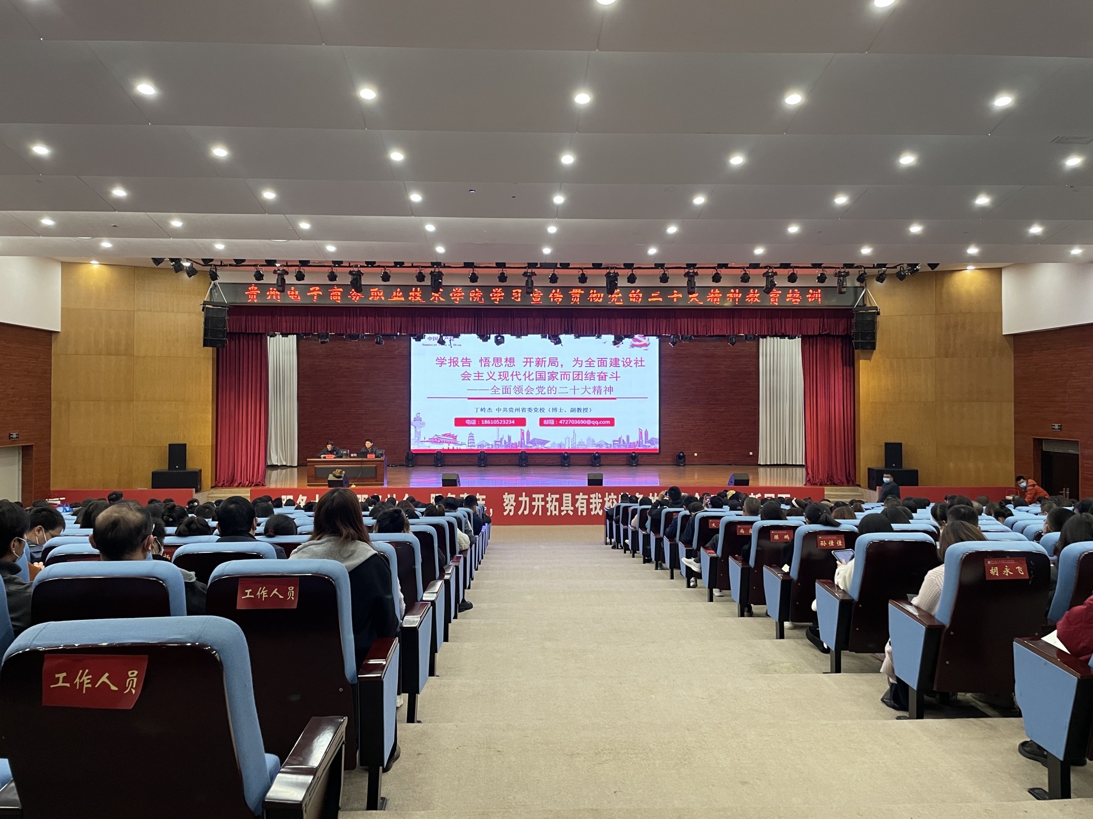 为深入学习宣传贯彻党的二十大精神,进一步全面领会习近平新时代中国特色社会主义思想,贵州电子商务职业技术学院邀请中共贵州省委党校的丁岭杰教授为全体教职工、学生预备党员和第4期发展对象培训班学生学员开展了《学习宣传贯彻党的二十大精神教育培训》。