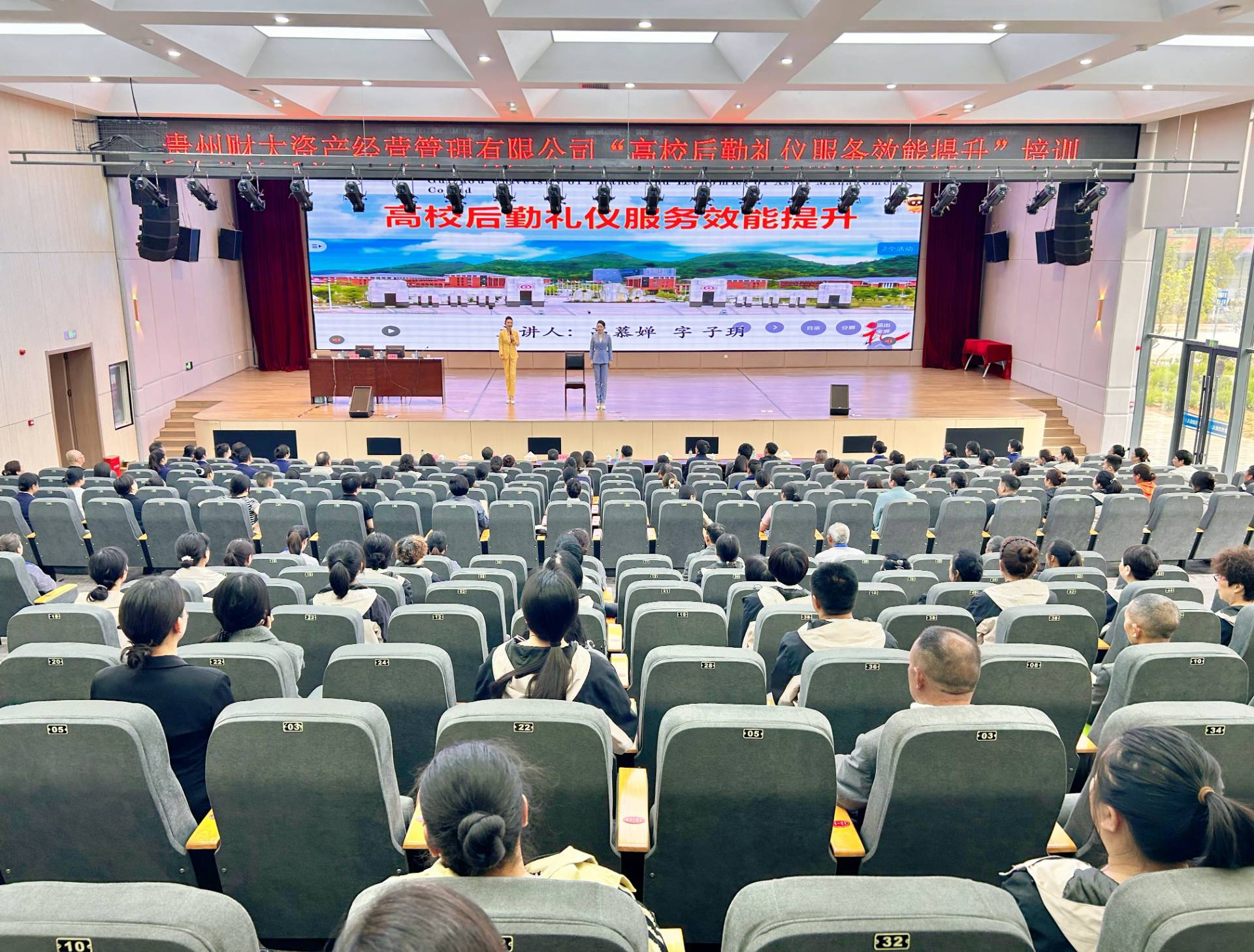 4月17日,贵州财经大学后勤处、资产公司联合开展“高校后勤礼仪服务效能提升”培训活动。后勤处处长胡张林、副处长陈其鑫、万作勇,资产公司总经理朱泉明、副总经理吴健、蒙刚出席培训活动,活动由吴健主持。后勤处各科室教职工及资产公司各部门员工近200人参加培训。