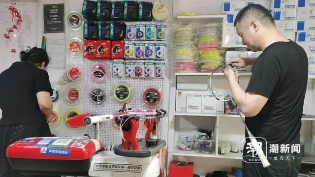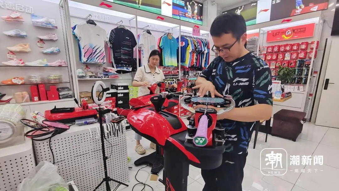 在记者近日的调查走访中,一位顾客来到浙江省杭州市滨江区一家体育用品店更换羽拍线。此时,老板刘海燕正在穿线,起身叮嘱客户得等等,“订单太多,最近一直熬到凌晨2点,取拍子要排到三天后。”在她的店铺,羽毛球用品放得满满当当,墙上挂着品种繁多的羽拍线,红、绿、紫、蓝等色彩多达十余种。另一侧墙角,一个纸箱里摆放着四五十副已经换好羽拍线的球拍。