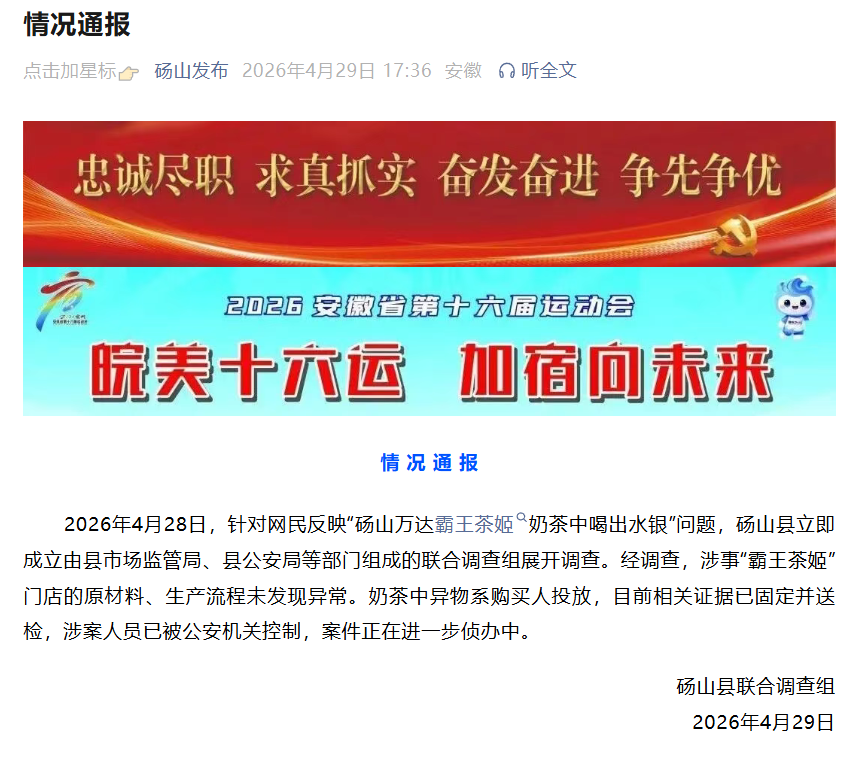 2026年4月28日,针对网民反映“砀山万达霸王茶姬奶茶中喝出水银”问题,砀山县立即成立由县市场监管局、县公安局等部门组成的联合调查组展开调查。经调查,涉事“霸王茶姬”门店的原材料、生产流程未发现异常。奶茶中异物系购买人投放,目前相关证据已固定并送检,涉案人员已被公安机关控制,案件正在进一步侦办中。