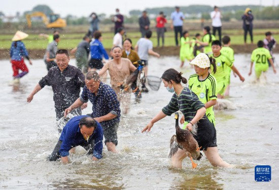 新华社发(陈凯摄)5月30日,在淮安市洪泽区岔河镇,人们在插秧节上参加抓鸭比赛。