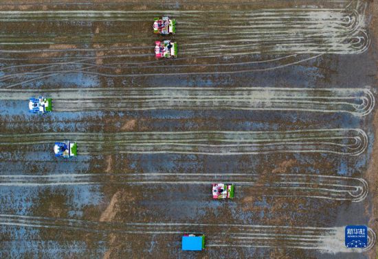 新华社发(贺敬华摄)5月30日在淮安市洪泽区岔河镇拍摄的机械插秧比赛(无人机照片)。