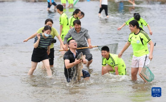 新华社发(殷潮摄)5月30日,在淮安市洪泽区岔河镇,人们在捉鱼比赛活动现场。