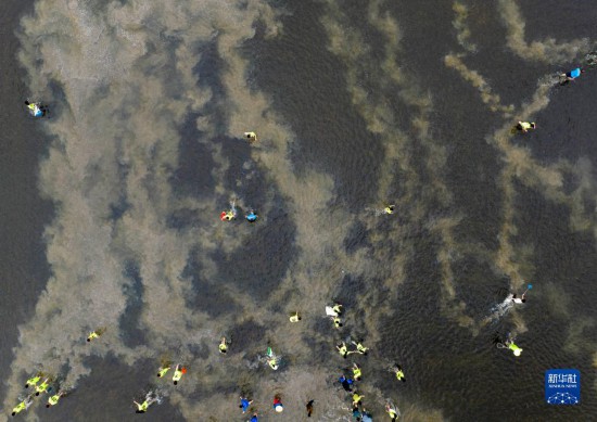 新华社发(殷潮摄)5月30日,在淮安市洪泽区岔河镇,人们在插秧节上参加摸鱼比赛(无人机照片)。