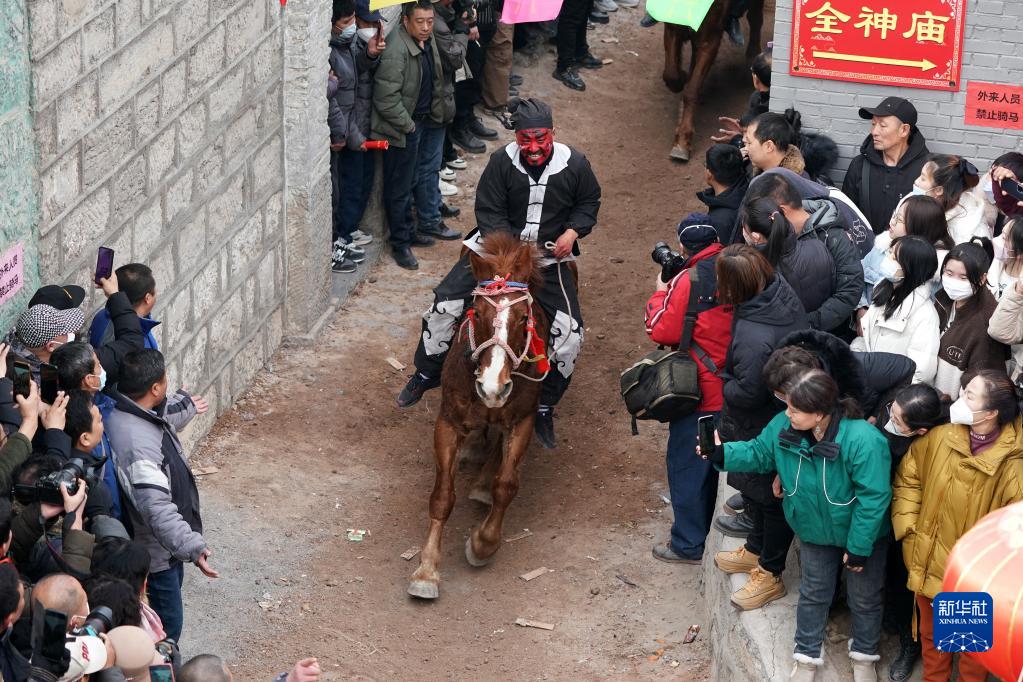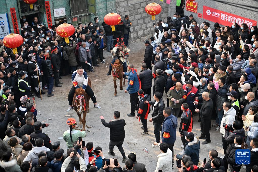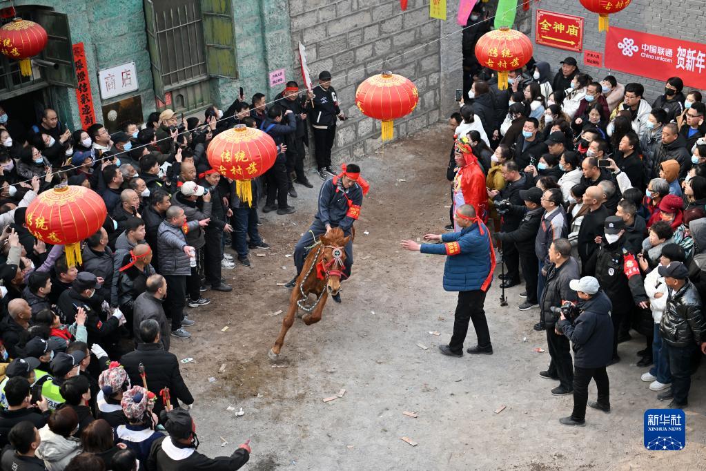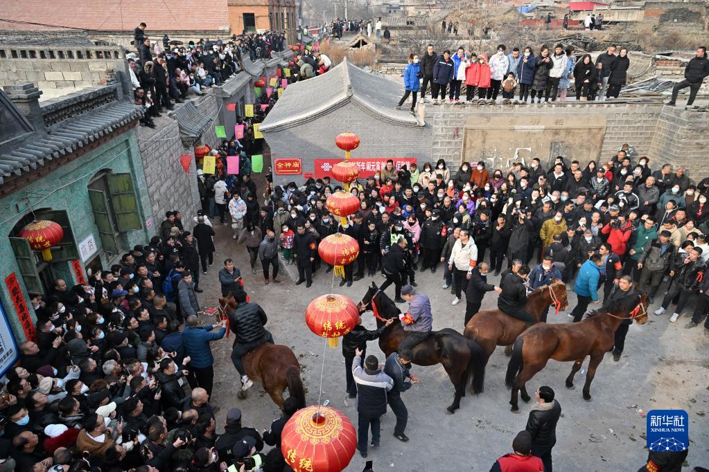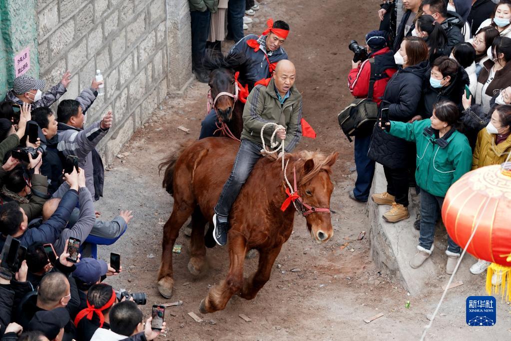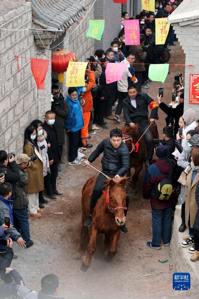 当日是农历正月十六,山西省阳泉市平定县下董寨村热闹非凡,当地特有的民俗活动——“跑马排”上演,村民骑着马在古巷里来回飞奔,吸引众多游客观看。
