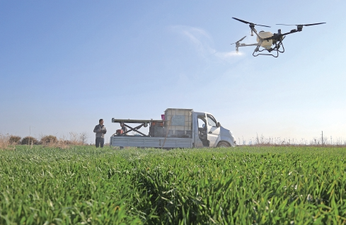 长江中下游地区进入小麦春季田管关键期,安徽农垦华阳河农场以农业社会化服务为抓手,为农户提供小麦施肥、除草及病虫害防治等托管服务,让农民轻松种田,为夏粮丰收打牢基础。图为近日,在安庆市宿松县复兴镇的麦田里,华阳河农场组织开展小麦无人机田管作业。李龙 摄(来源:大国三农)