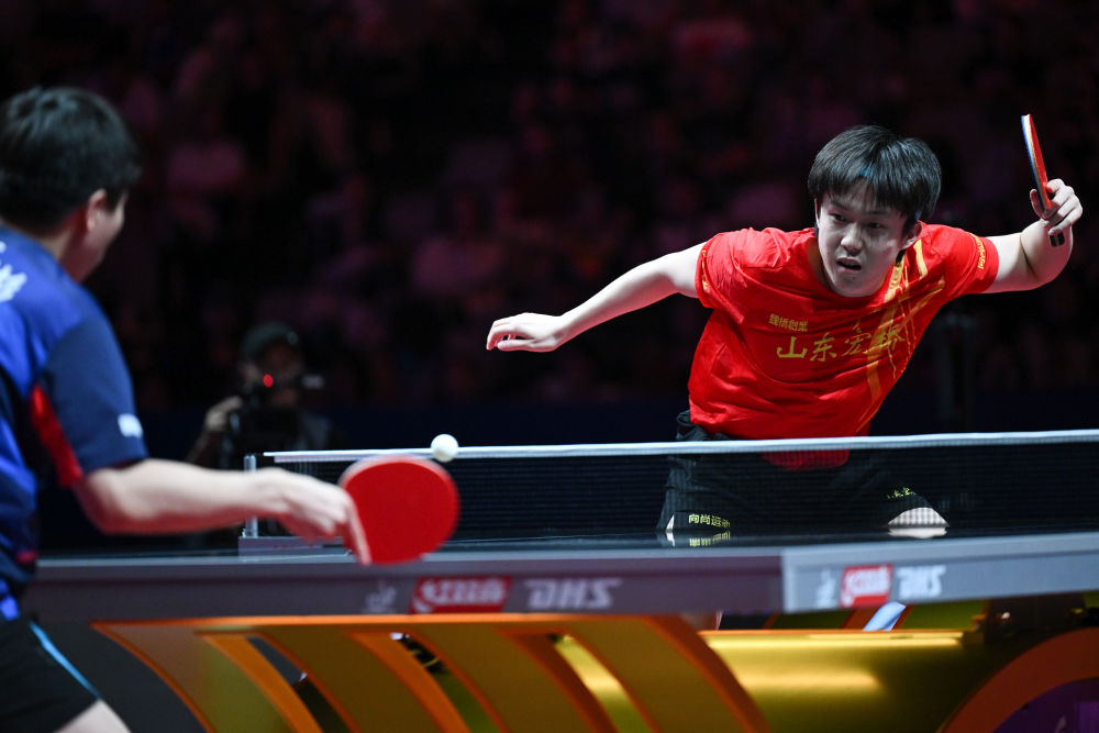 8月31日,山东魏桥·向尚运动队选手王楚钦(右)在比赛中。他在单打比赛中2:3不敌山东鲁能队选手徐瑛彬。新华社记者 丁磊 摄