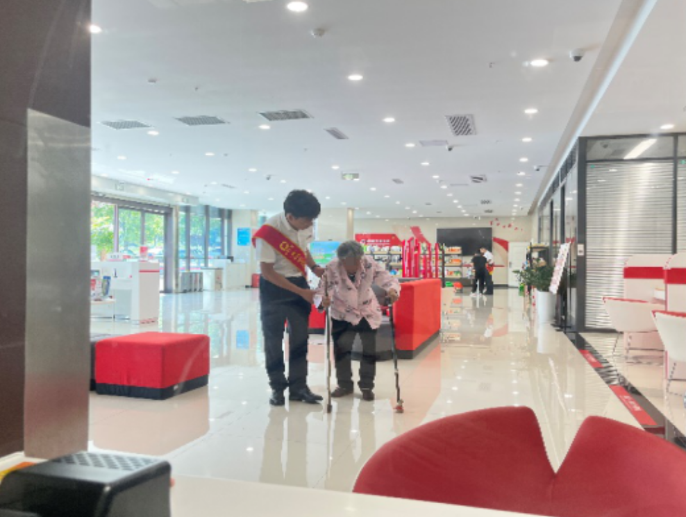 当天,一位拄着双拐的老人来到修文支行营业部办理业务。工作人员见状立即上前搀扶,引导至休息区。经询问得知,老人刚做完腿部手术,行动不便且听力欠佳,此次因银行卡遗失,急需取现支付医药费及家庭开支。