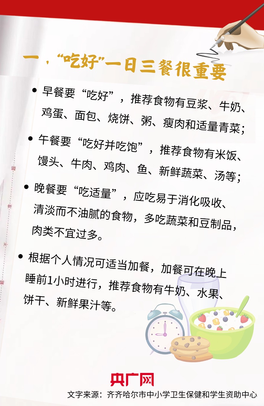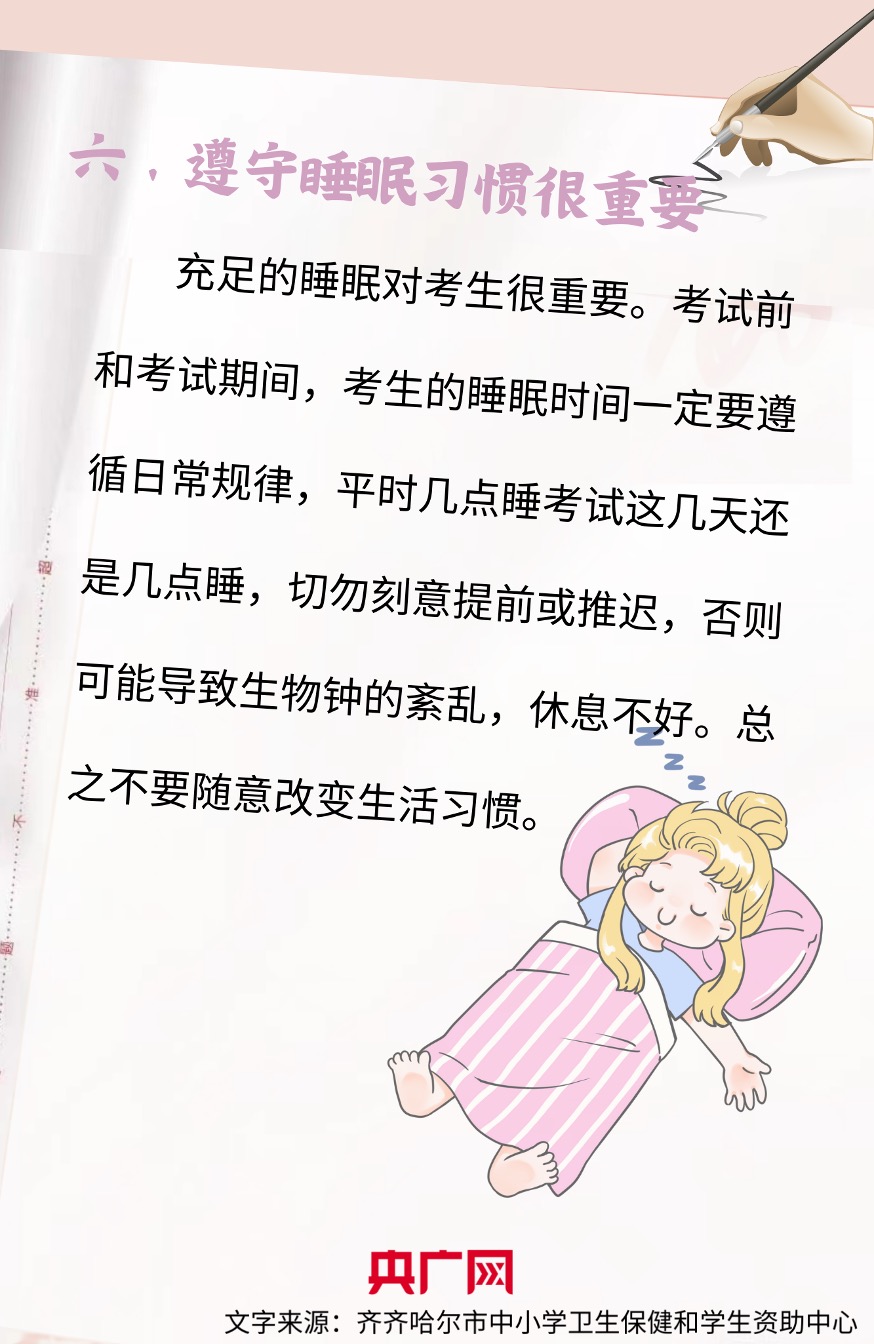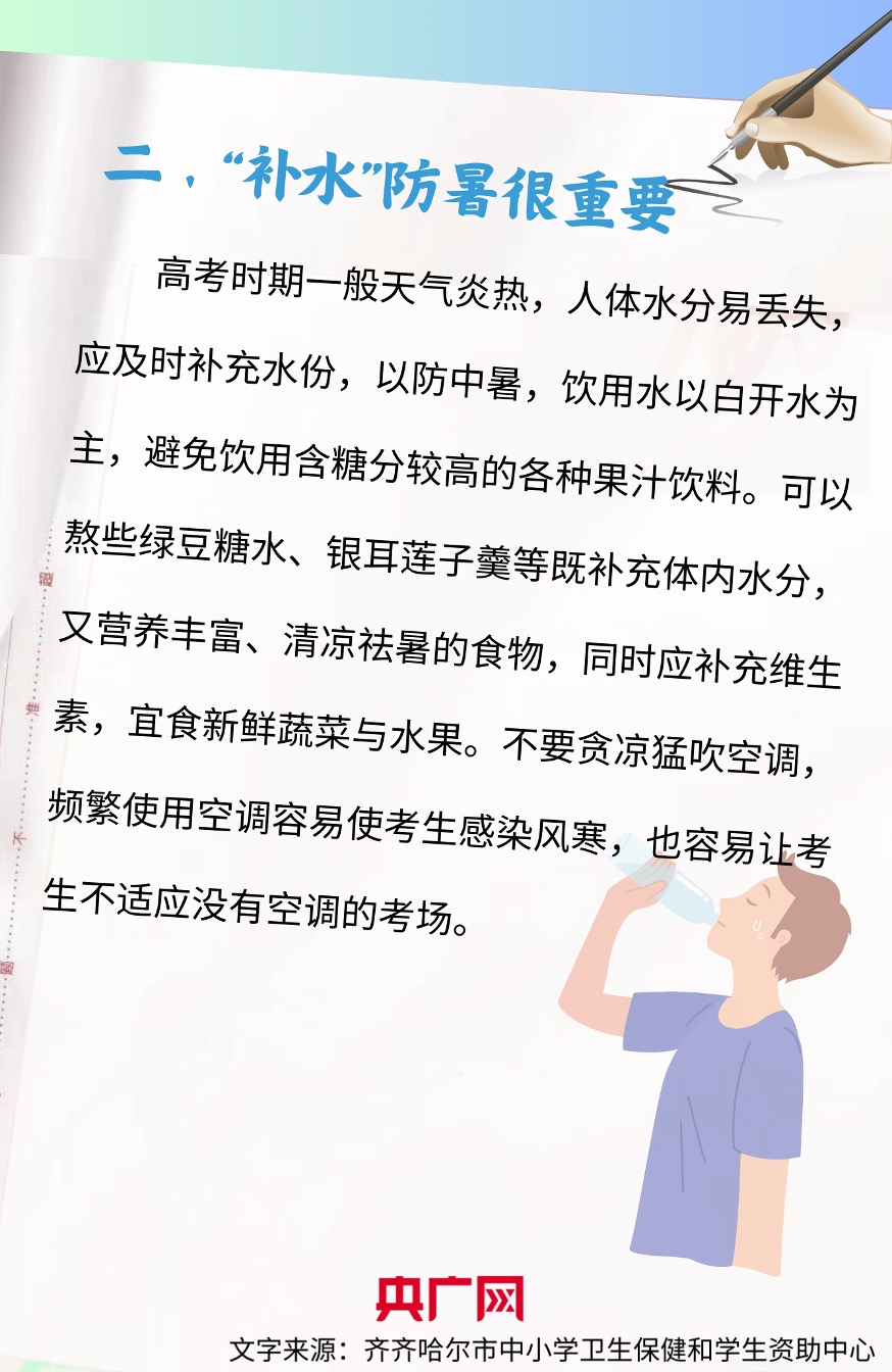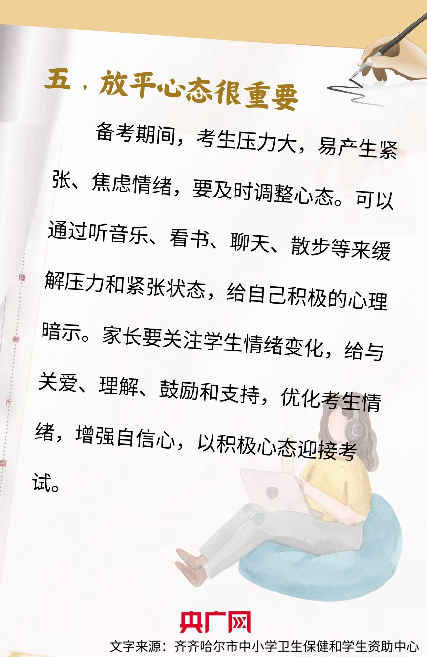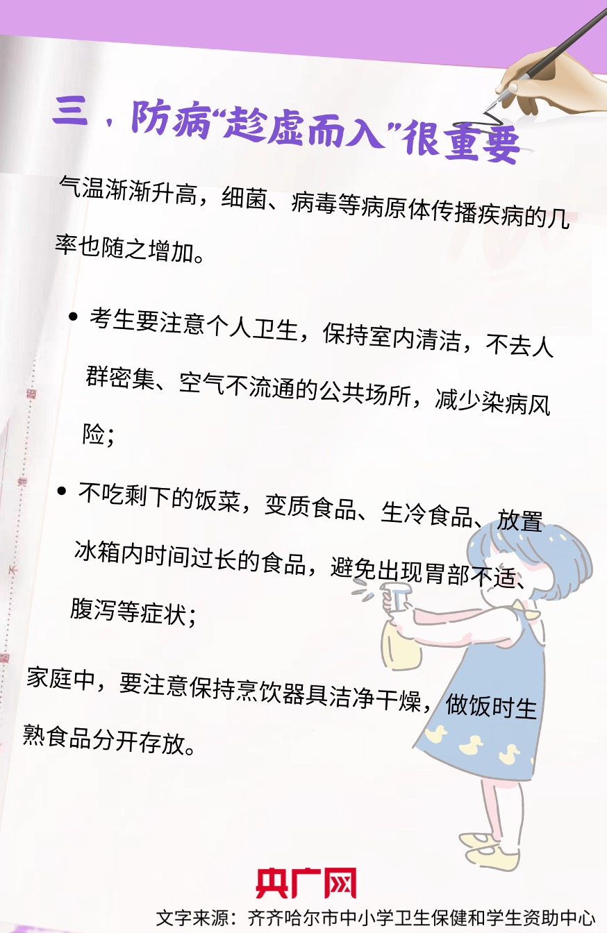 央广网哈尔滨5月30日消息(记者庞淼 实习生张玉欣)一年一度的高考进入倒计时,学生们奋力拼搏,家长们翘首以盼,迎接这件人生大事。考生们正处在最关键的冲刺阶段,如何安排饮食、作息,做好心理调节尤为重要,这份考生健康备考指南新鲜出炉,请您查收!