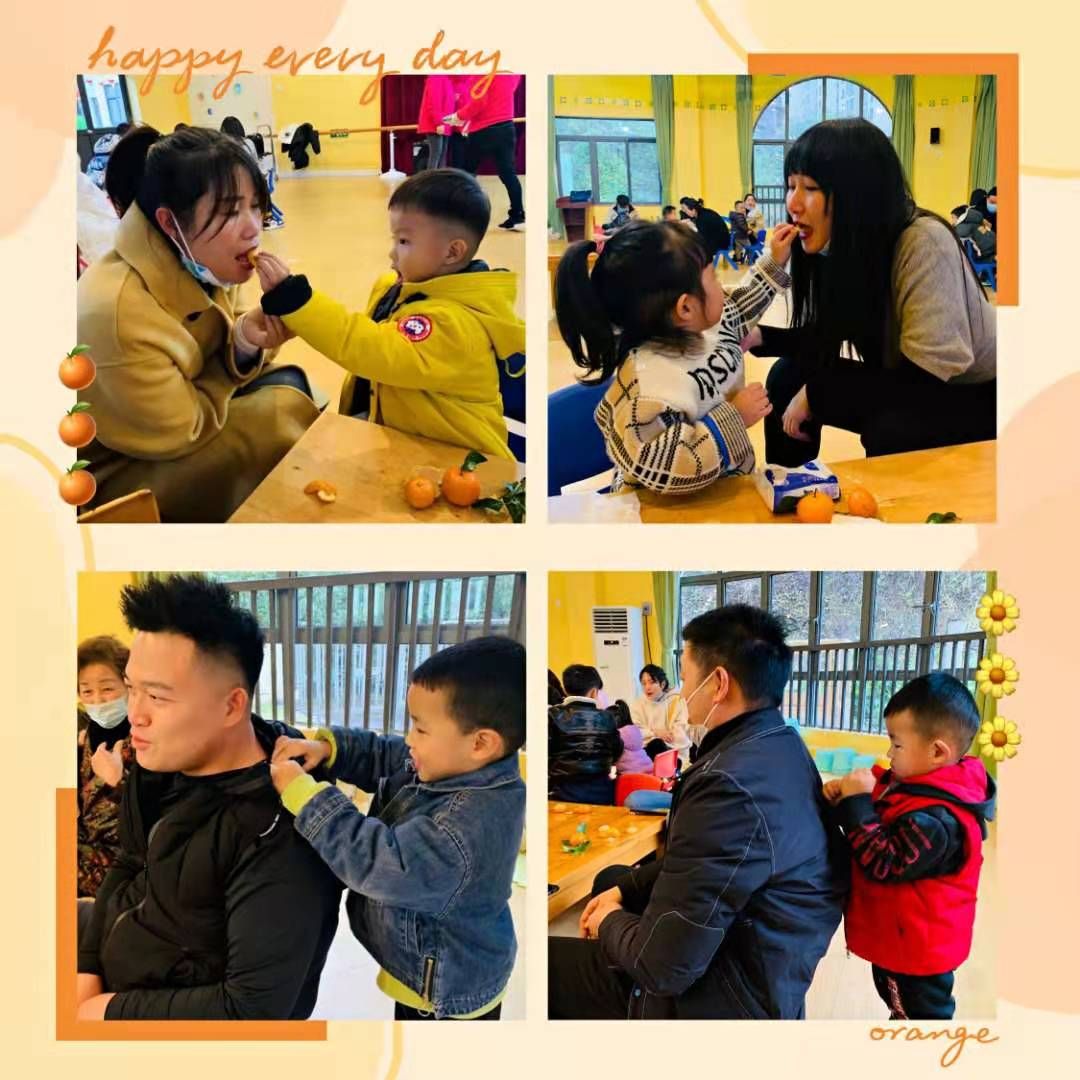 甜蜜蜜:幼儿剥橘子给家长吃,给家长捶捶背。