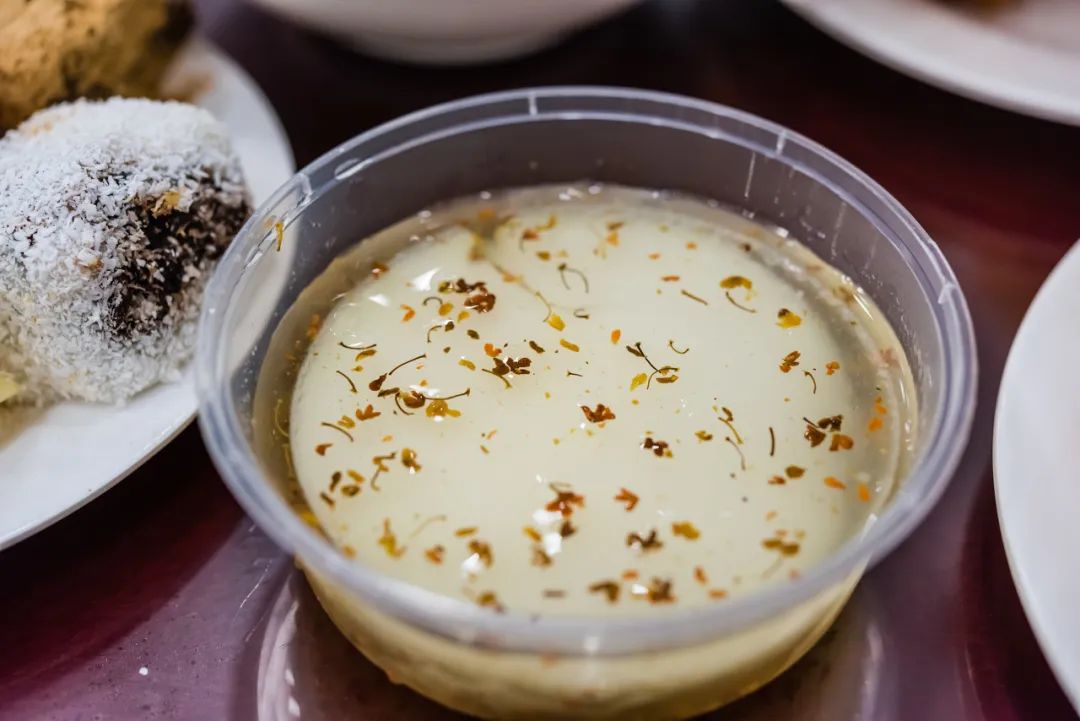 材料:绿茶水100毫升,杏仁4克,桂花2克,冰糖25克。