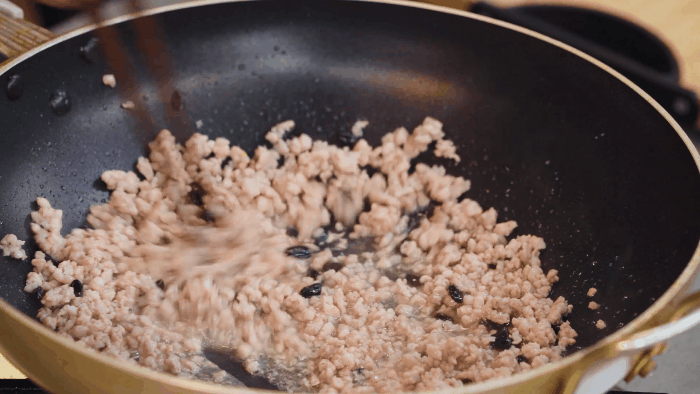 锅中加入少许油,肉末入锅煸香,加入黑豆豉,翻炒均匀直至变色。