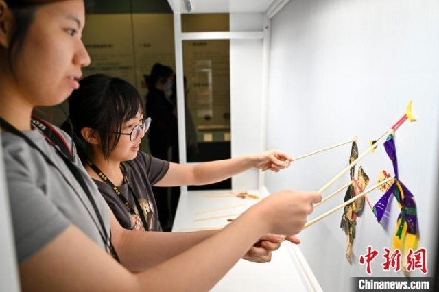 媒体记者体验皮影艺术。陈骥旻 摄
