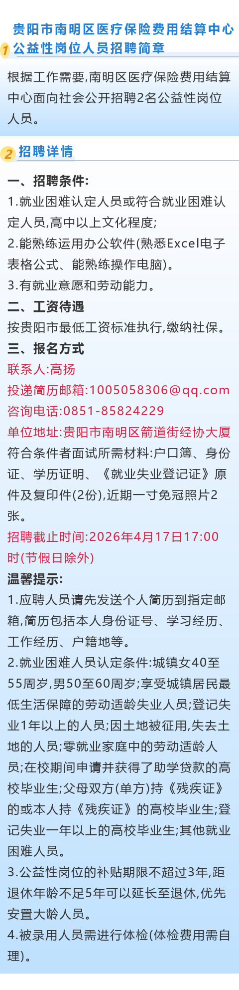 贵阳市南明区医疗保险费用结算中心招聘!报名截止时间:4月17日!