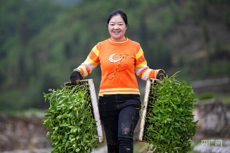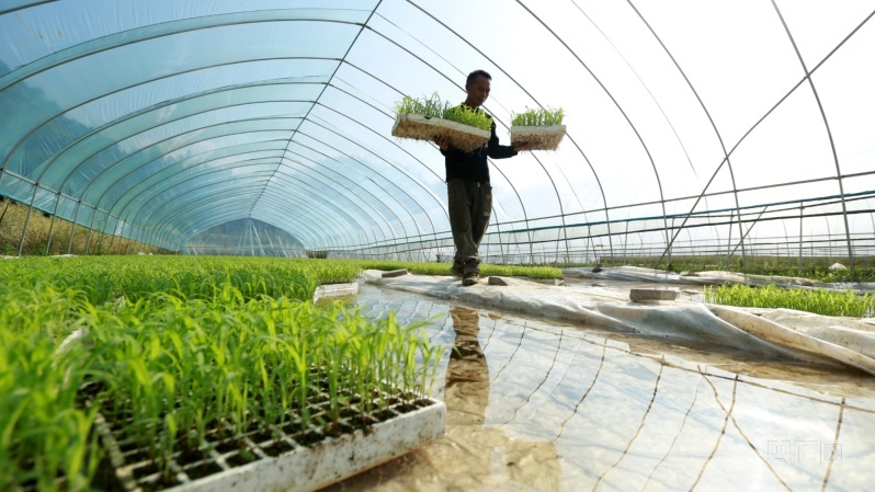 在黔南州都匀市小围寨街道马尾村育苗大棚里,村民正在搬运高粱幼苗(央广网发 肖伟 摄)