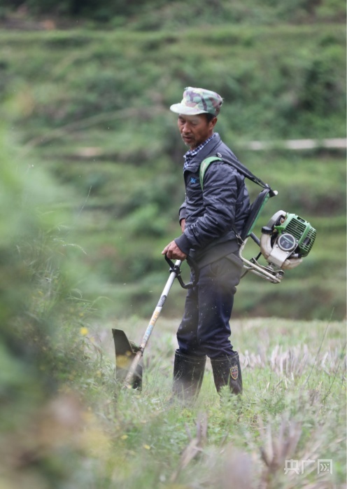 在黔东南州施秉县杨柳塘镇望江村,村民正在用割草机给田坎除草(央广网发 磨桂宾 摄)