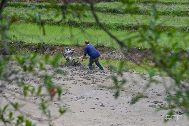 在铜仁市江口县坝盘镇挂扣村,村民正在翻犁水田(央广网发 李鹤 摄)