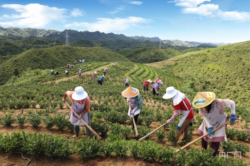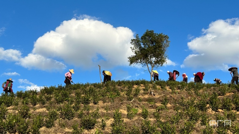 在黔东南州凯里市大风洞镇青杠林村云溪白茶基地,村民们正在松土施肥(央广网发 陈丹 摄)