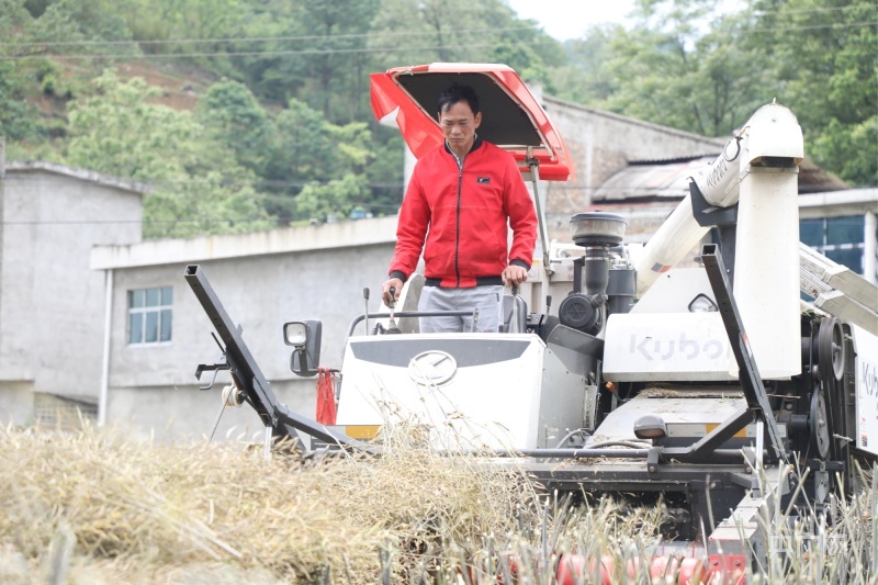 在黔南州长顺县摆所镇长高村,村民正操作油菜收割机在田里进行收割作业(央广网发 黔南日报社供图)