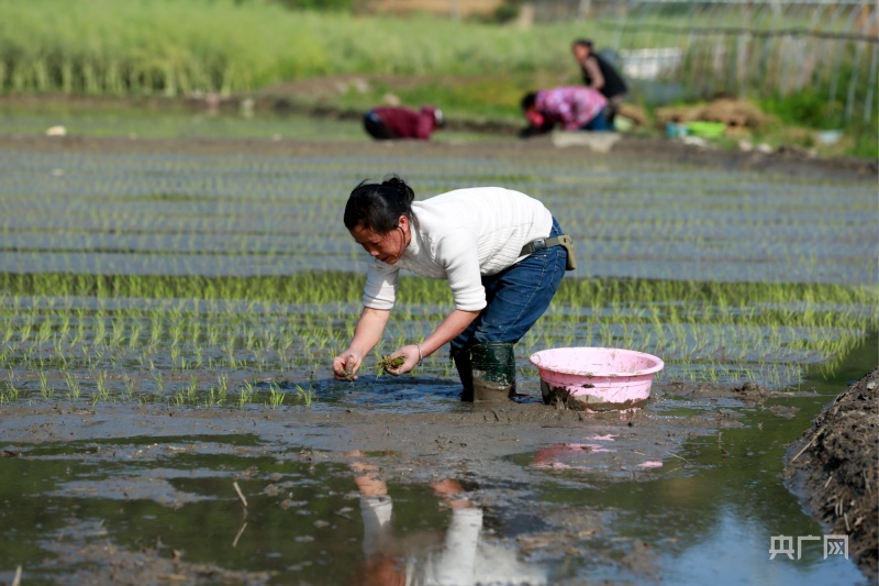 在黔南州都匀市匀东镇大坪村,村民正在田里插秧。(央广网发 肖伟 摄)