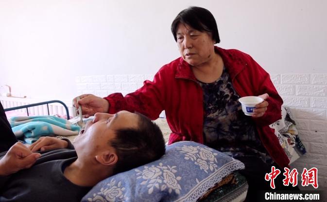 图为聂淑兰给儿子喂饭。马月摄