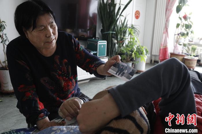 图为聂淑兰给儿子翻看以前的照片。张静摄